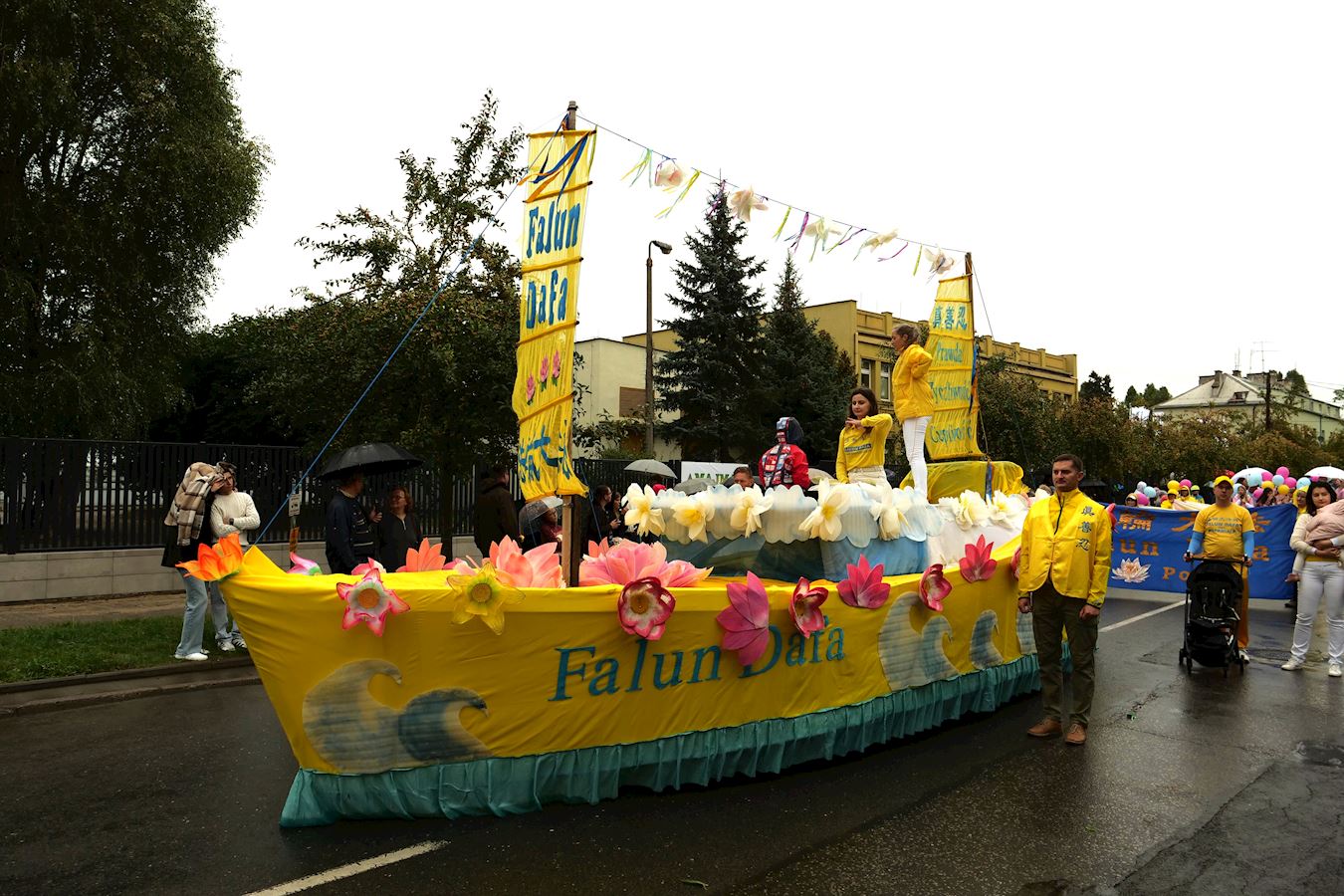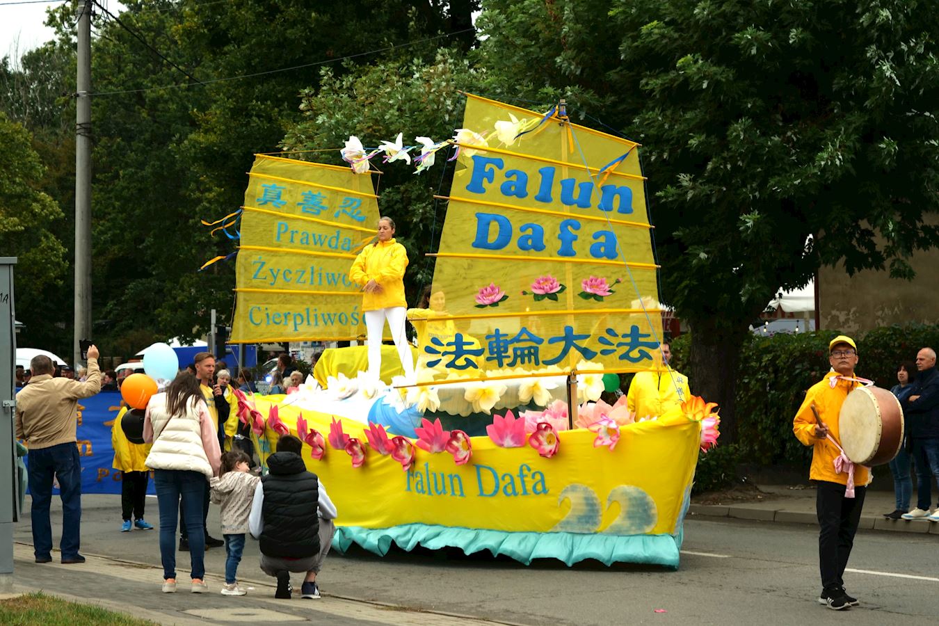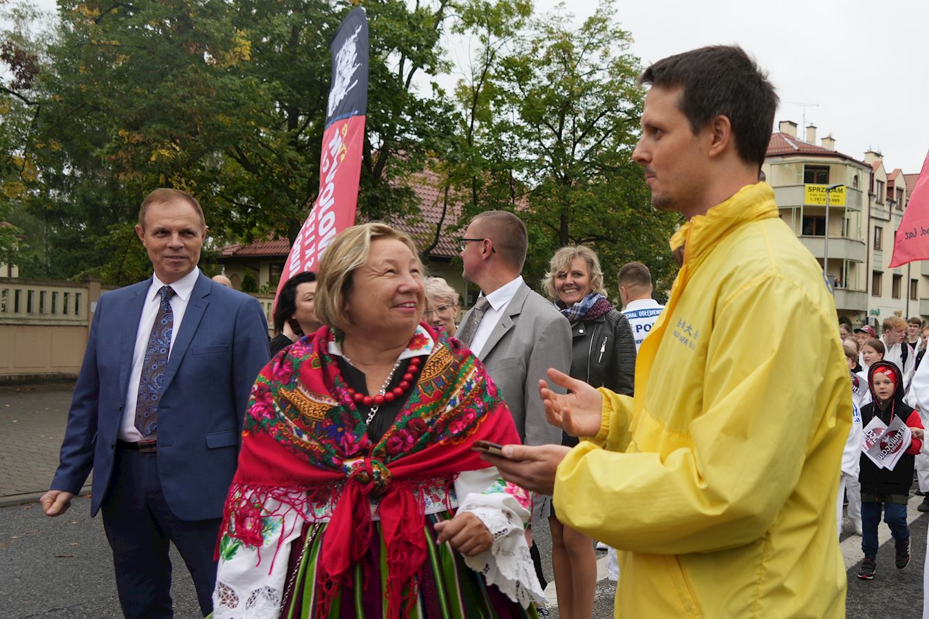 有一位身着色彩亮丽民族服装的特洛伊•乌苏拉(Trojan Urszula)女士兴致勃勃地走在游行队伍中间。