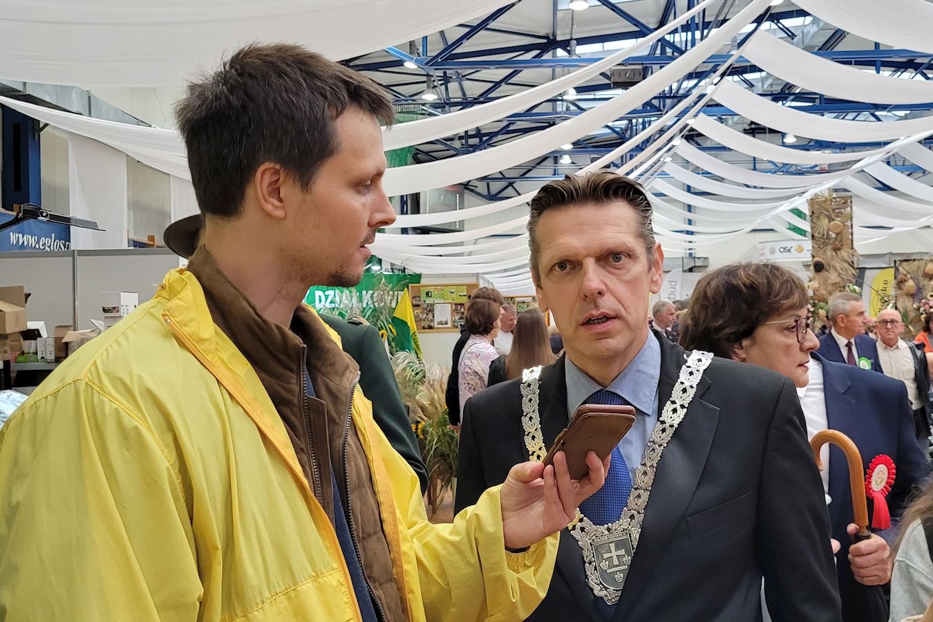 斯凯尔涅维采市议会主席雅罗斯瓦夫•切西莱夫斯基(Jarosław Chęcielewski)先生站在主席台上,全程观看了“鲜花水果蔬菜”丰收节大游行,并发表了讲话。