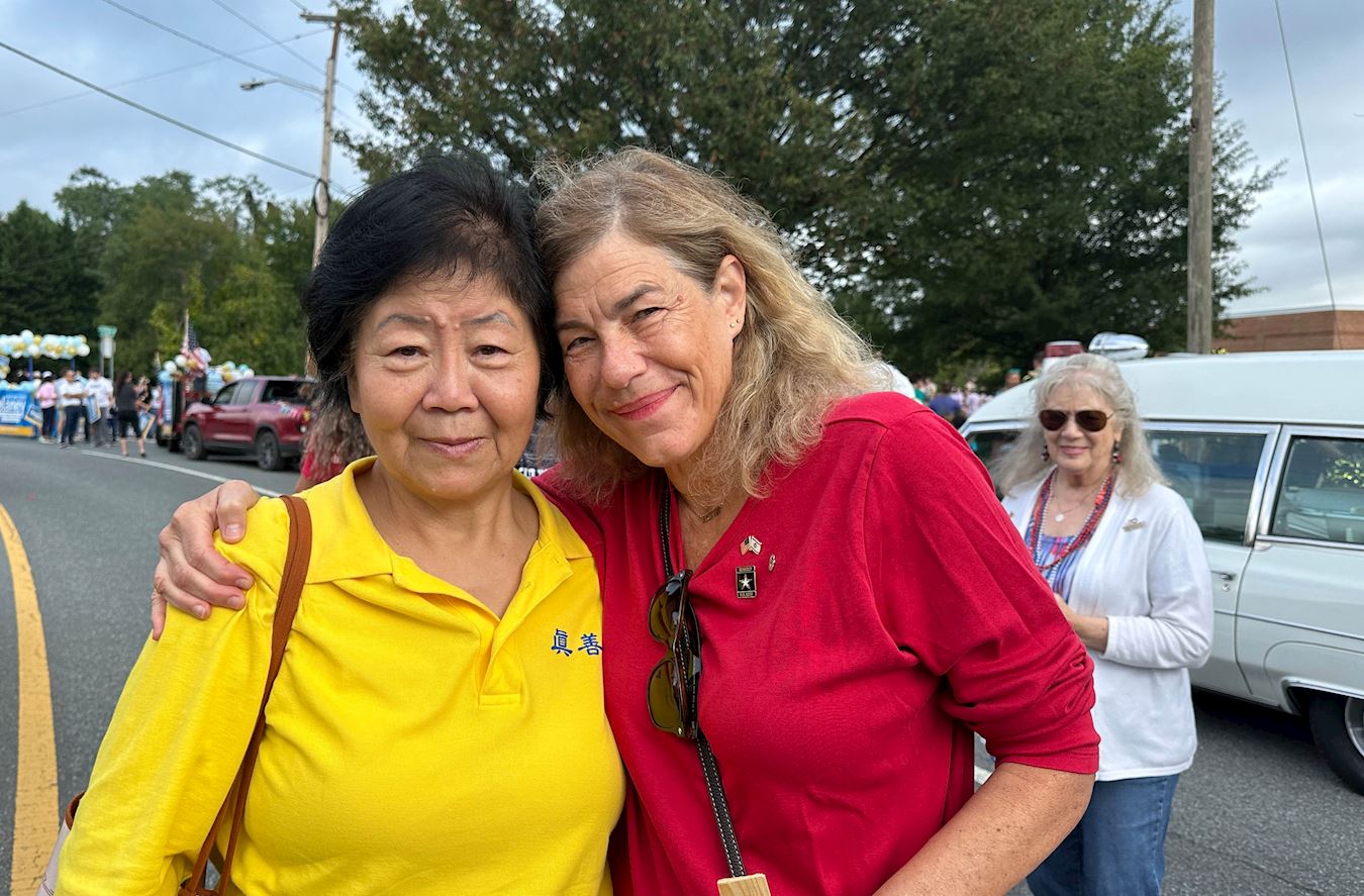 来参加游行的艾米女士看到一位法轮功学员从她的身边经过,她给那位学员一个大大的拥抱。她说:“因为我喜欢你们所做的事情,我喜欢你们所代表的(价值观)。我知道发生了什么事。”