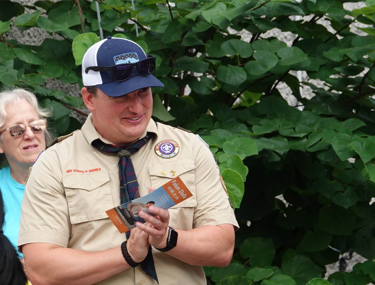 ![]() 图13:观看游行的民众接过法轮功学员递给他的传单,仔细阅读传单的内容。左上为蒙郡消防部门任职的蒂姆(Tim)。 |