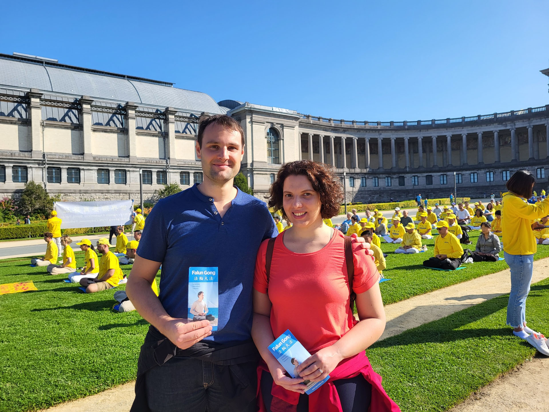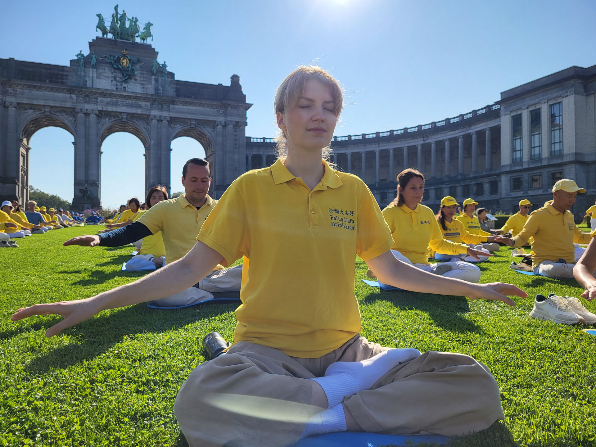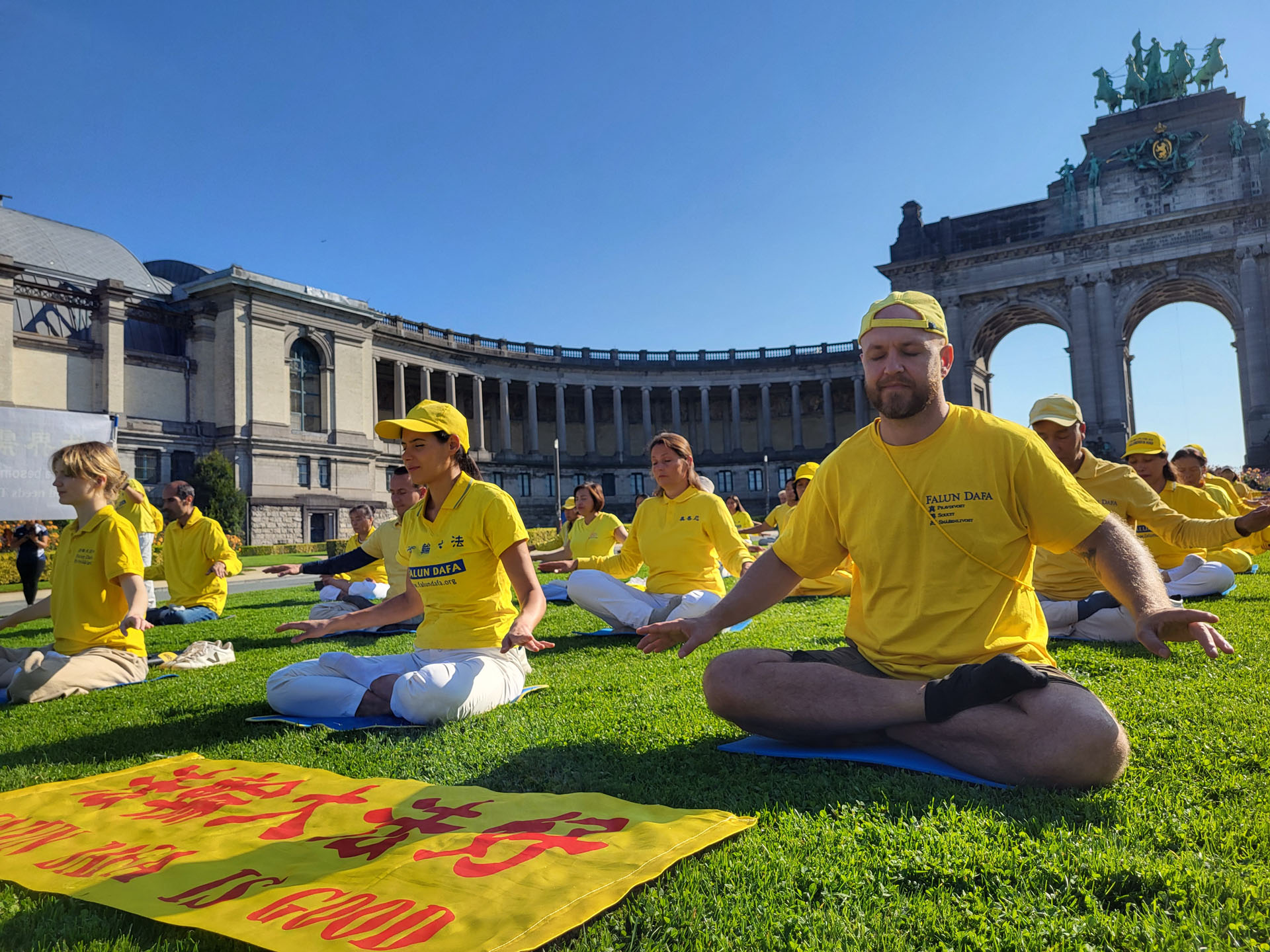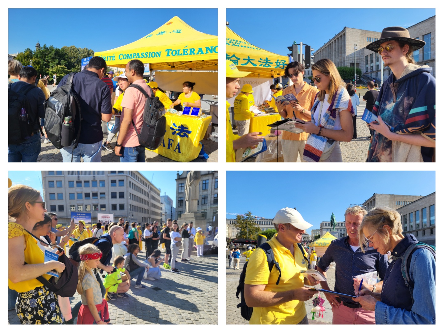 上午时分,在艺术山旁的布鲁塞尔五十年宫公园(Parc du Cinquantenaire)里,欧洲学员们展示了法轮功的五套功法。雄伟的五十年宫建筑近旁的草坪上,绿茵茵青草衬托身着黄色炼功服的法轮功学员,格外引人注目。五十年宫是布鲁塞尔的地标之一,为纪念比利时独立五十周年而修建的。 下午,法轮功学员在市中心的布鲁塞尔艺术山讲真相。周边是漂亮的花园区以及比利时皇家图书馆(KBR)、布鲁塞尔广场和国家美术馆。法轮功学员们以修炼人积极乐观的慈善心态,向民众介绍真善忍、揭露中共迫害。围观的民众络绎不绝、流连忘返。