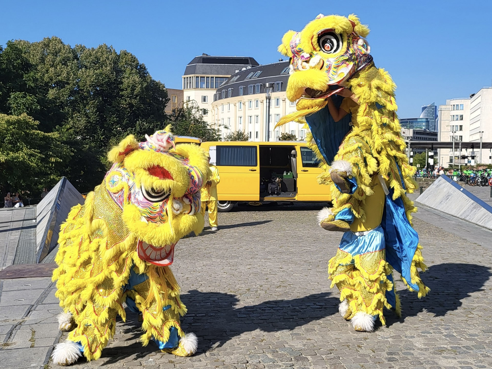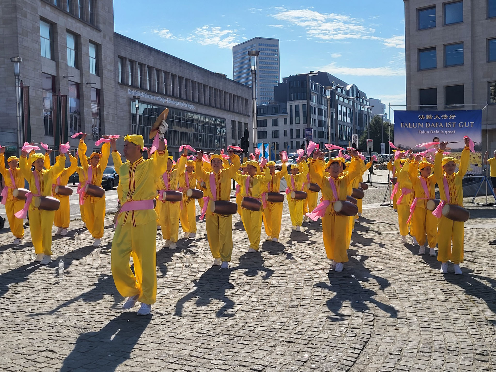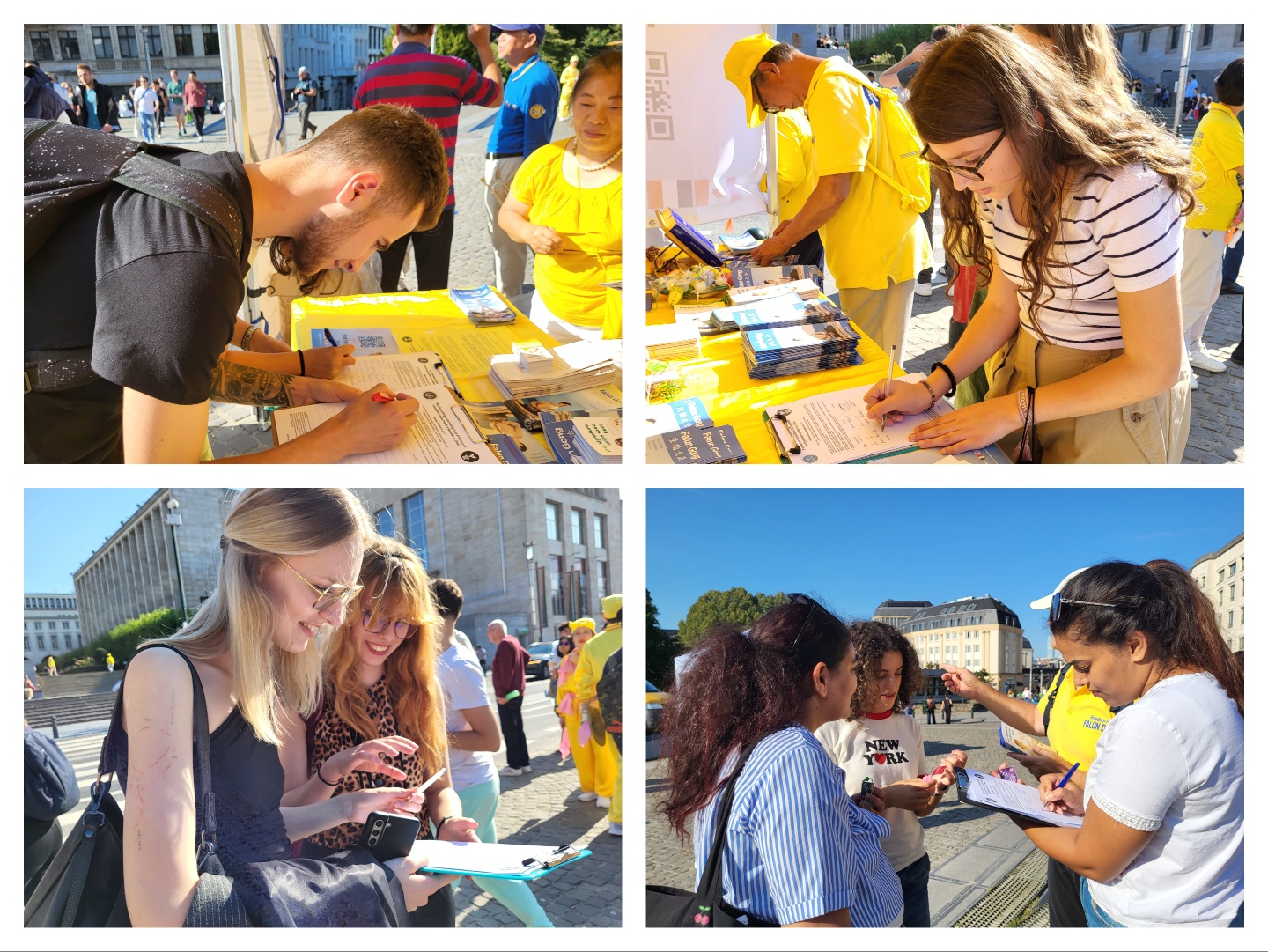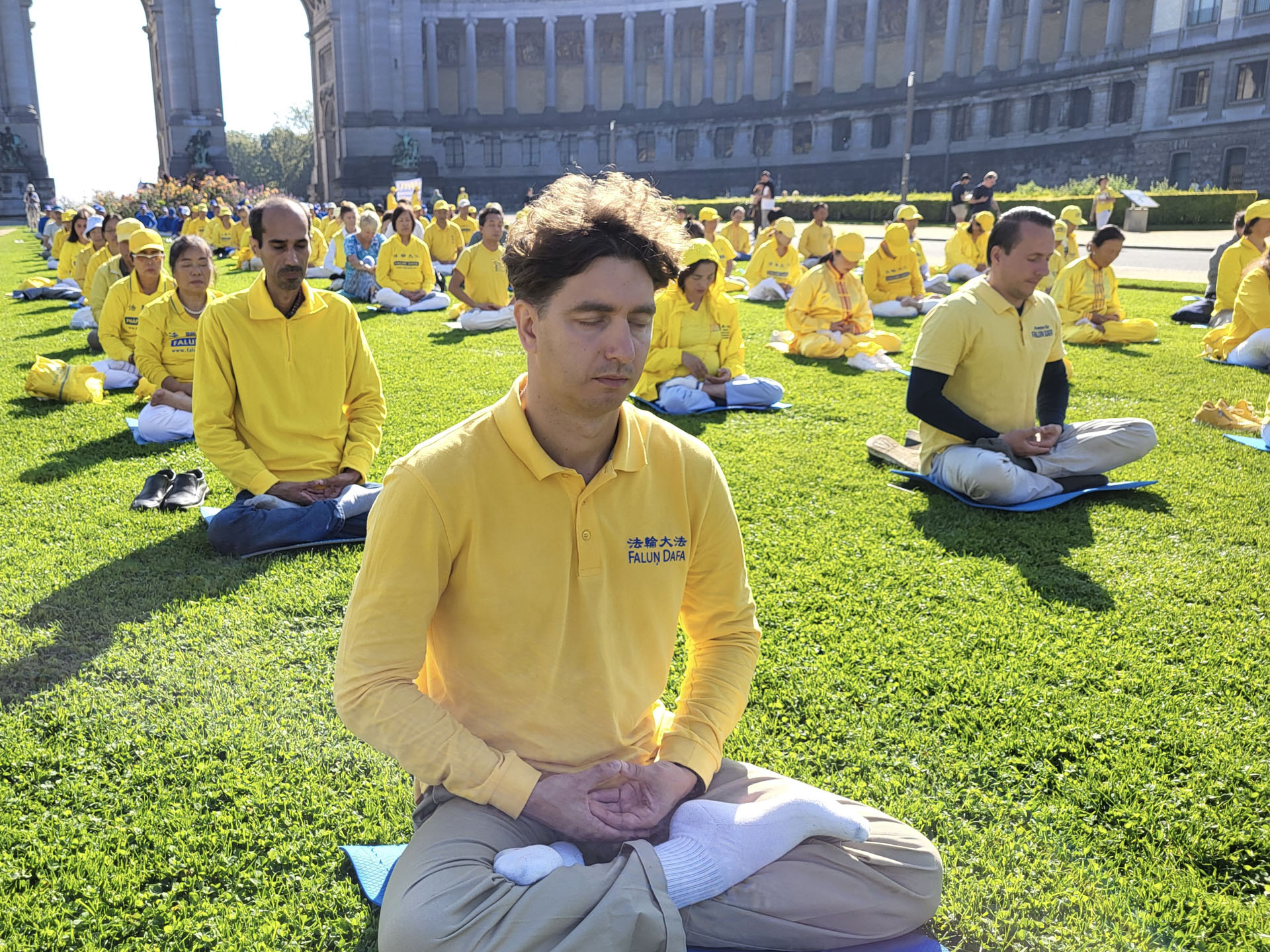 上午时分,在艺术山旁的布鲁塞尔五十年宫公园(Parc du Cinquantenaire)里,欧洲学员们展示了法轮功的五套功法。雄伟的五十年宫建筑近旁的草坪上,绿茵茵青草衬托身着黄色炼功服的法轮功学员,格外引人注目。五十年宫是布鲁塞尔的地标之一,为纪念比利时独立五十周年而修建的。 下午,法轮功学员在市中心的布鲁塞尔艺术山讲真相。周边是漂亮的花园区以及比利时皇家图书馆(KBR)、布鲁塞尔广场和国家美术馆。法轮功学员们以修炼人积极乐观的慈善心态,向民众介绍真善忍、揭露中共迫害。围观的民众络绎不绝、流连忘返。
