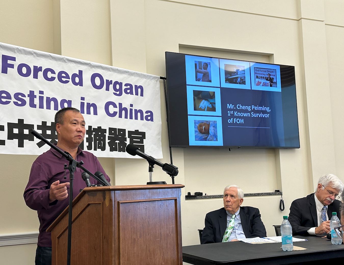 ![]() 图2:二零二四年九月四日,法轮功学员程佩明在美国国会众议院向在场的国会工作人员,媒体记者讲述了自己被活摘器官的遭遇,并感谢美国政府的营救。 |