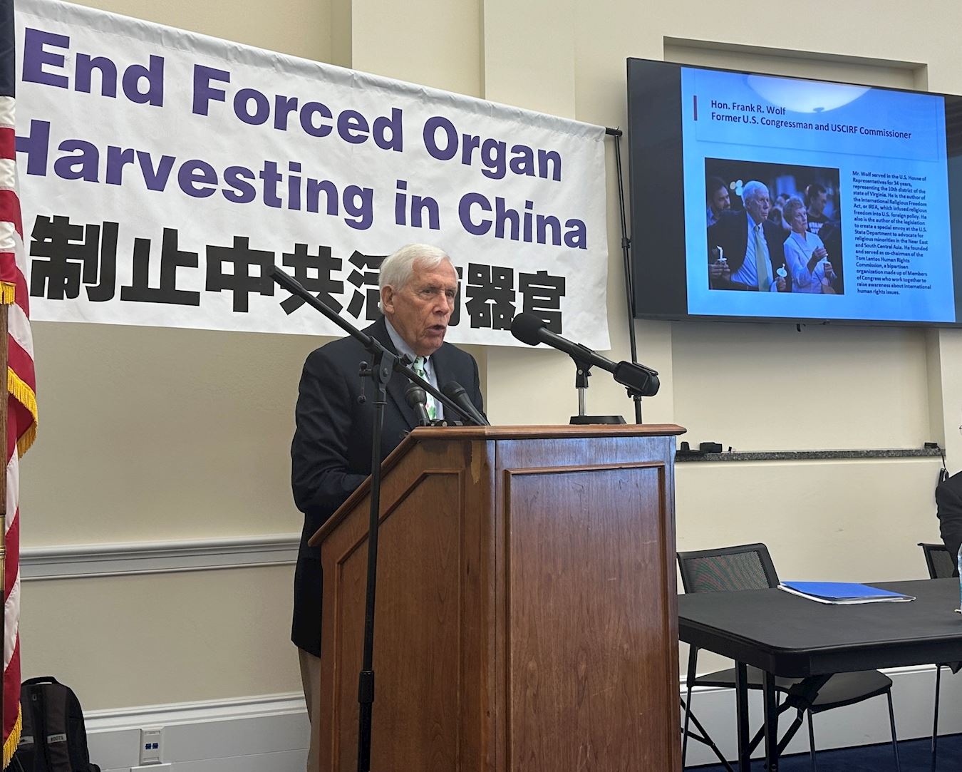 ![]() 图7:二零二四年九月四日,前美国国会议员弗兰克‧沃尔夫(Frank Wolf)在记者会上发言。 |
