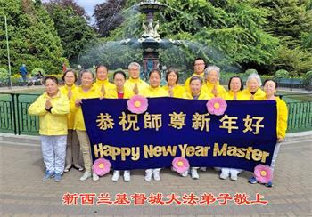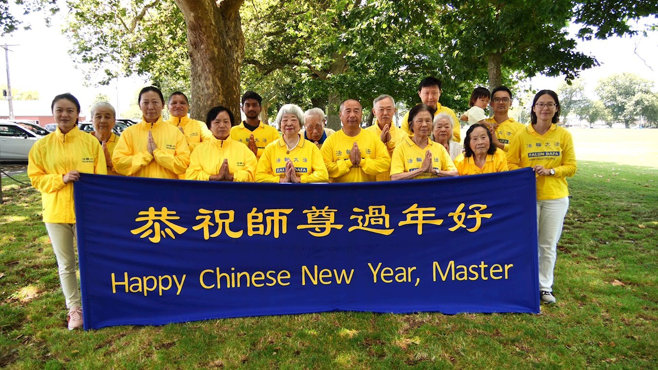 2025年,新西兰汉密顿市大法弟子于钢铁公园恭祝师尊过年好!