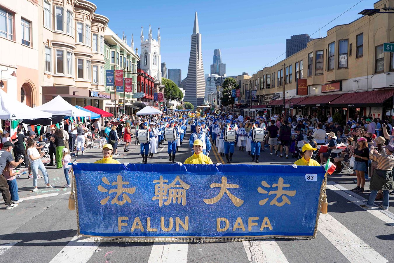 “再次感谢天国乐团。”主持人说,“他们一直是旧金山意大利传统文化游行的亮点之一。天国乐团已经参与游行超过十五年了。感谢你们的支持。”