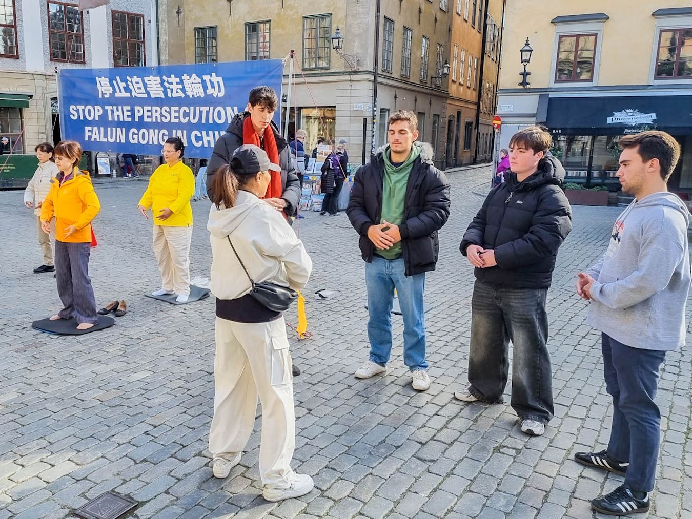 面对诺贝尔博物馆前小广场上川流不息的人群,法轮功学员伴随着悠扬的炼功音乐展示五套功法,以和平理性的方式讲述着法轮功真相,揭露中共在中国境内境外迫害法轮功的罪行。很多人被醒目的横幅、展板,宁静祥和的炼功场面所震撼。人们都主动接资料、观看展板或与学员交谈,得知中共采取各种卑鄙流氓手段迫害修炼真、善、忍的人,纷纷谴责中共独裁暴政并签名支持反迫害,不少人对功法感兴趣,当场就学炼功动作。