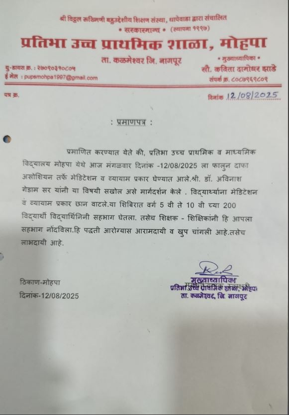 “兹证明,二零二五年八月十二日,星期二,阿维纳什·格达姆博士(Dr. Avinash Gedam)和法轮大法学员在莫赫帕的新英语高中与初级学院教法轮大法功法。