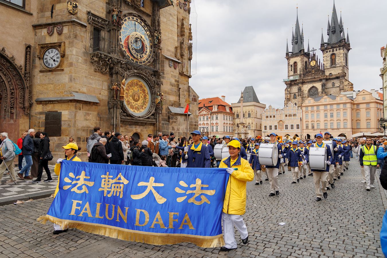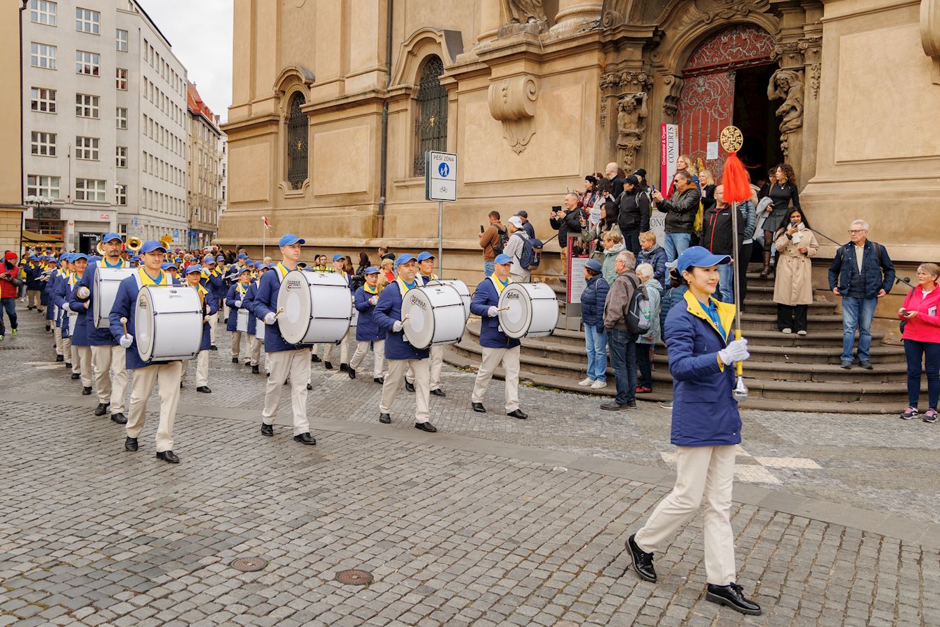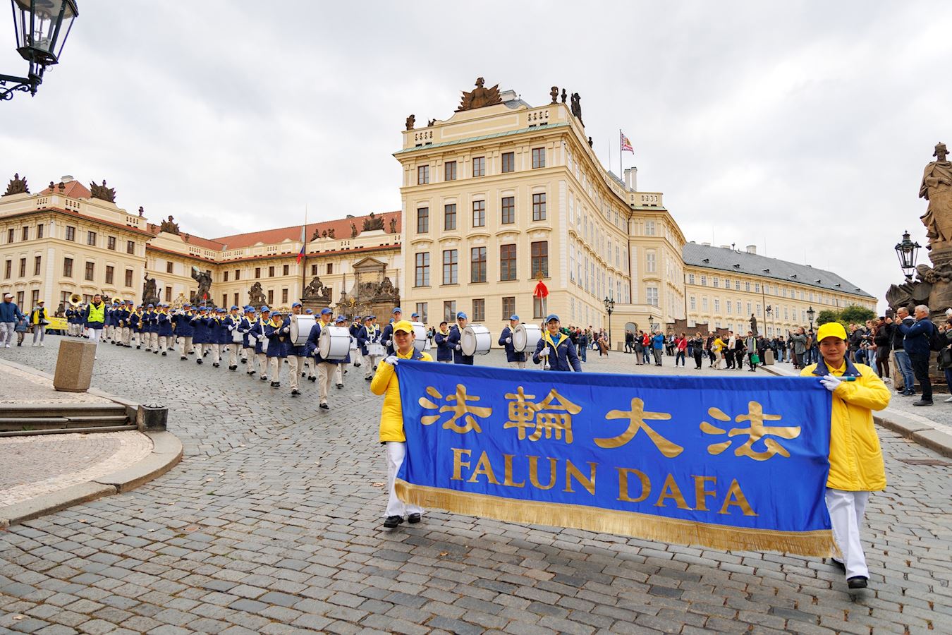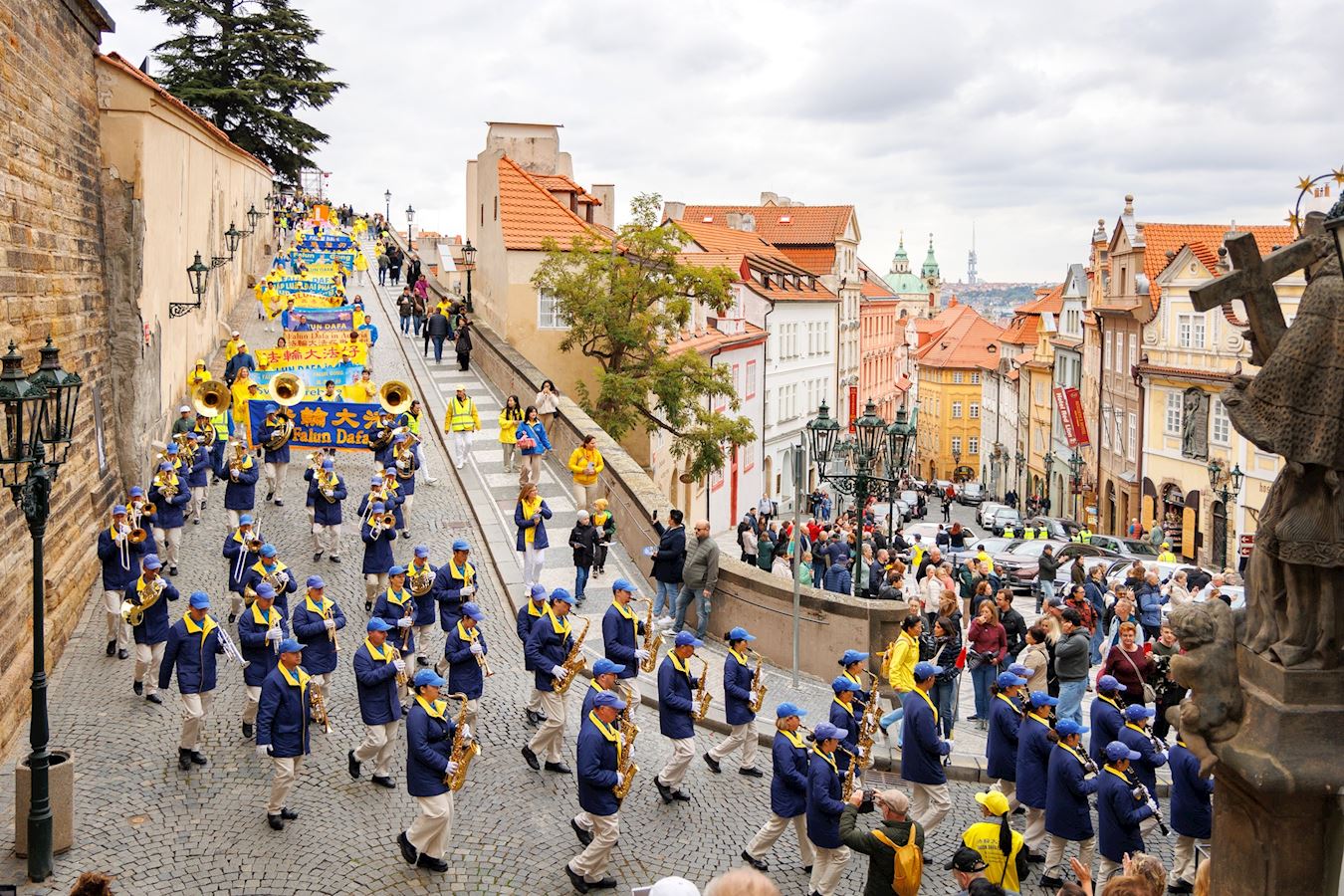 上午十一点,游行队伍从布拉格城堡山广场(Hradčanské Square)出发,行至终点旧城区广场(Old Town Square)。道两旁的游客和当地市民纷纷驻足欣赏节奏明快的音乐,观赏色彩缤纷的游行队伍。游行队伍中,除了演奏乐曲的天国乐团之外,还有舞龙、舞狮、手持莲花的仙女队、以及铿锵有力的腰鼓表演。很多观众拿出手机拍照和录像,并主动接受法轮功真相传单。