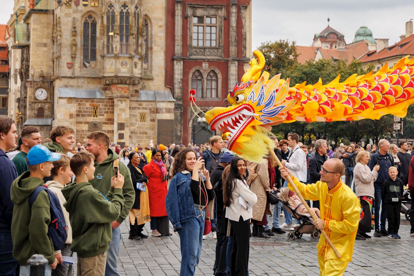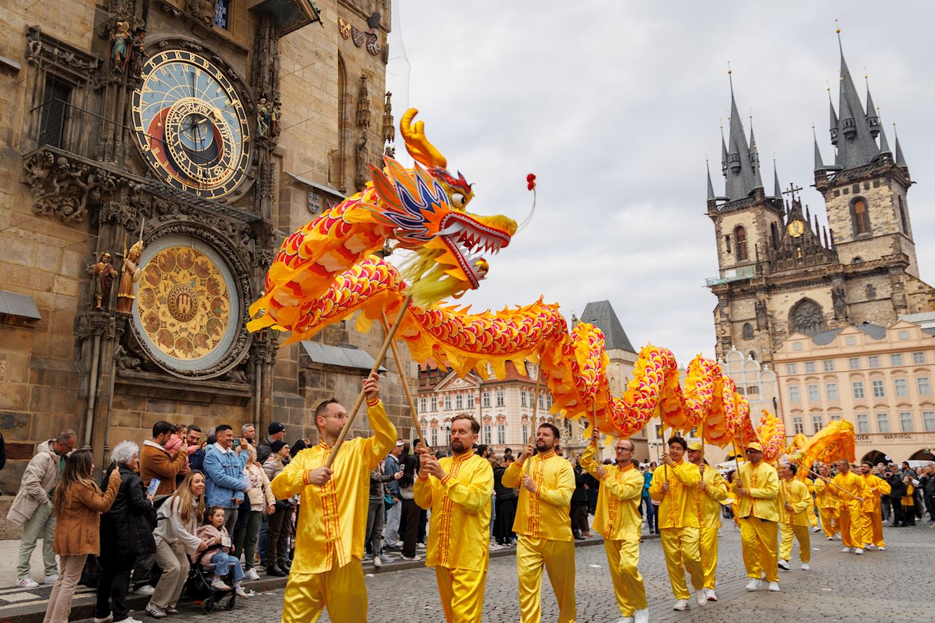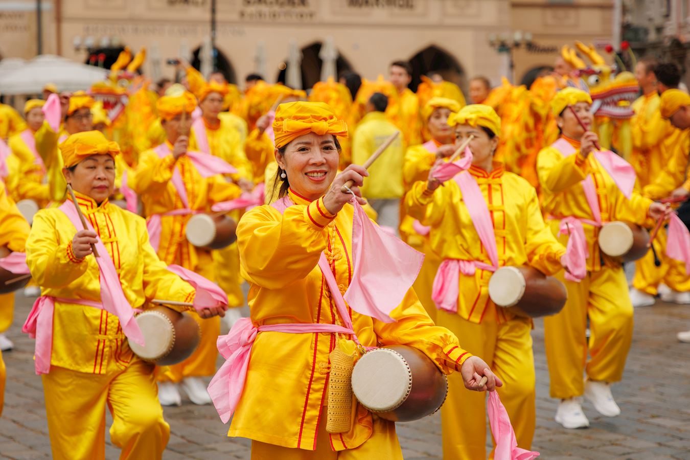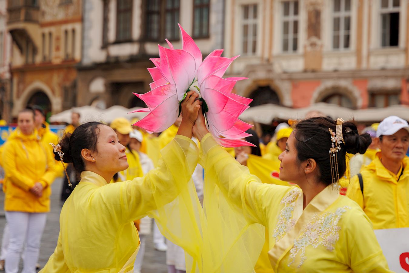 上午十一点,游行队伍从布拉格城堡山广场(Hradčanské Square)出发,行至终点旧城区广场(Old Town Square)。道两旁的游客和当地市民纷纷驻足欣赏节奏明快的音乐,观赏色彩缤纷的游行队伍。游行队伍中,除了演奏乐曲的天国乐团之外,还有舞龙、舞狮、手持莲花的仙女队、以及铿锵有力的腰鼓表演。很多观众拿出手机拍照和录像,并主动接受法轮功真相传单。