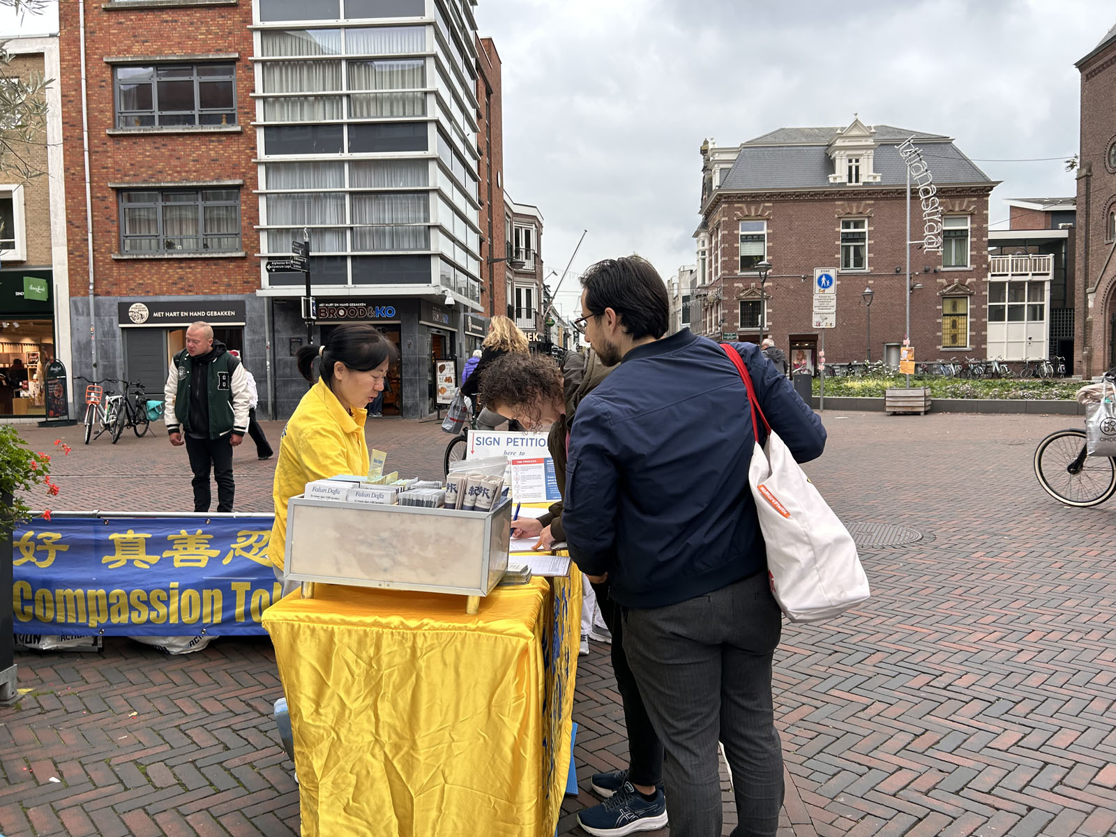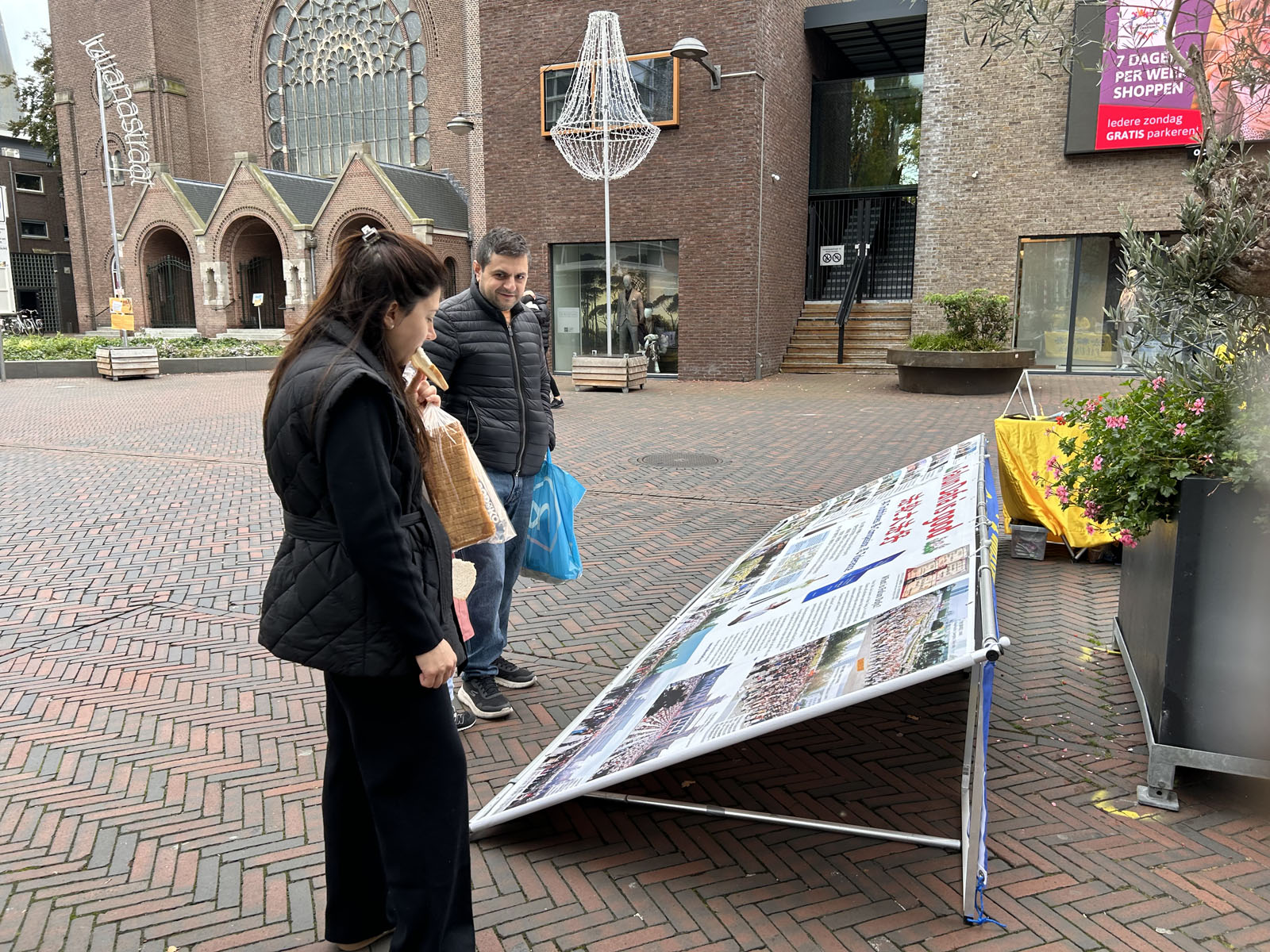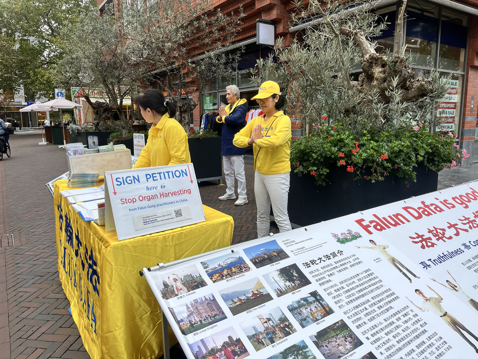 莱茵河畔阿尔芬(Alphen aan den rijn)是南荷兰省(Zuid Holland)的一个市镇。拥有约十二万居民,总面积为一百三十二平方公里。中午时分,学员们在尤利娅娜街(Julianastraat)布置真相展板,展示法轮功五套功法,与民众讲述真相,向民众征集反对迫害的签名。人们认真跟着学炼功动作,向学员了解大法真相。