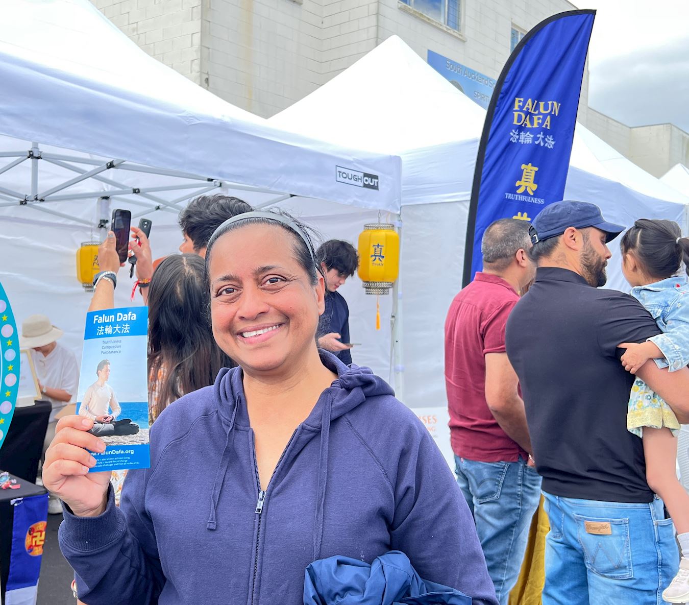 银行职员雪琳·穆罕默德(Shereen Mohammad)来到法轮功展位,她对法轮功学员展现的平和与善意印象深刻。
