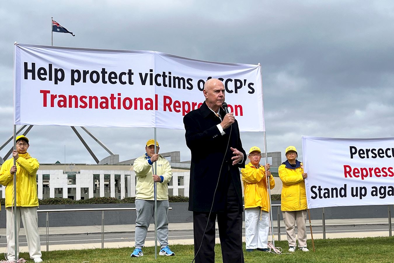 澳洲法轮大法学会发言人约翰·戴乐(John Deller)在集会上发言时表示:“跨国镇压是一种跨越国界的镇压形式,透过中共体制从中国大陆流出的这种镇压,影响范围很广。”