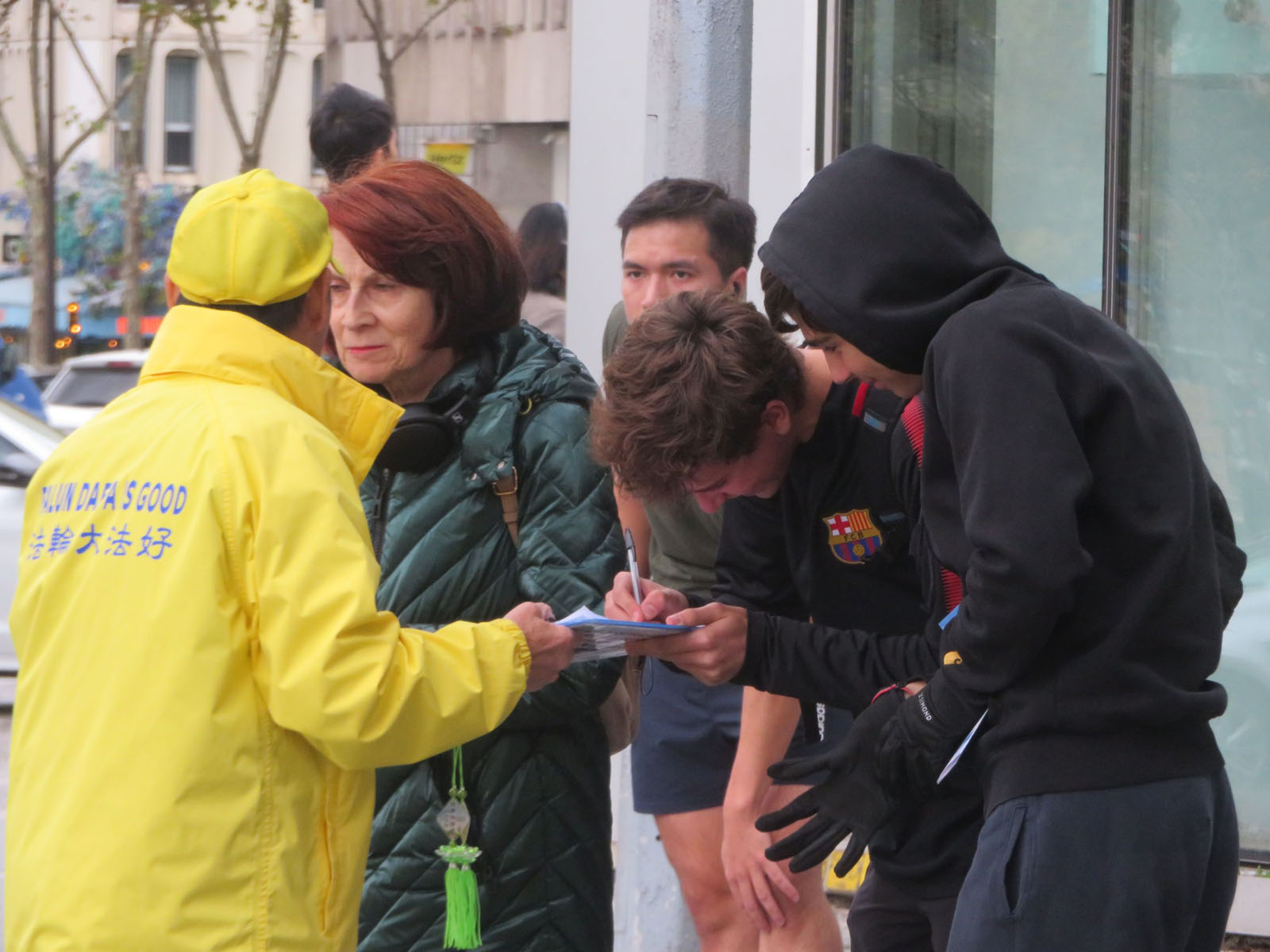 娜塔莉(Nathalie)是社会工作者,这天她偶然经过,第一次听说法轮功和活摘器官,感到非常震惊。她说:“这样随意夺取人的器官实在是太疯狂了。因此,他们其实会死去。”她说这让她感到非常不安,她表示会在她的网页上分享这些相关信息和视频,尽她所能地支持法轮功。临别,她对法轮功学员说:“谢谢你们来到这里,勇于说出真相。祝你们好运!”