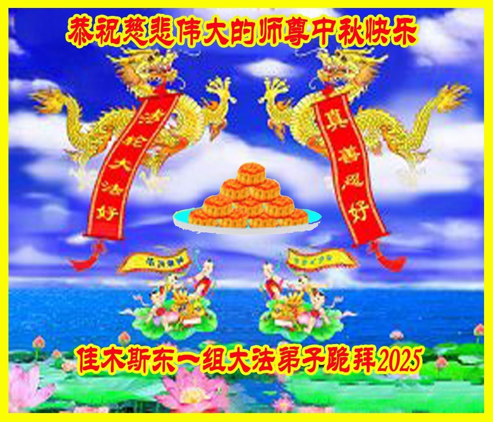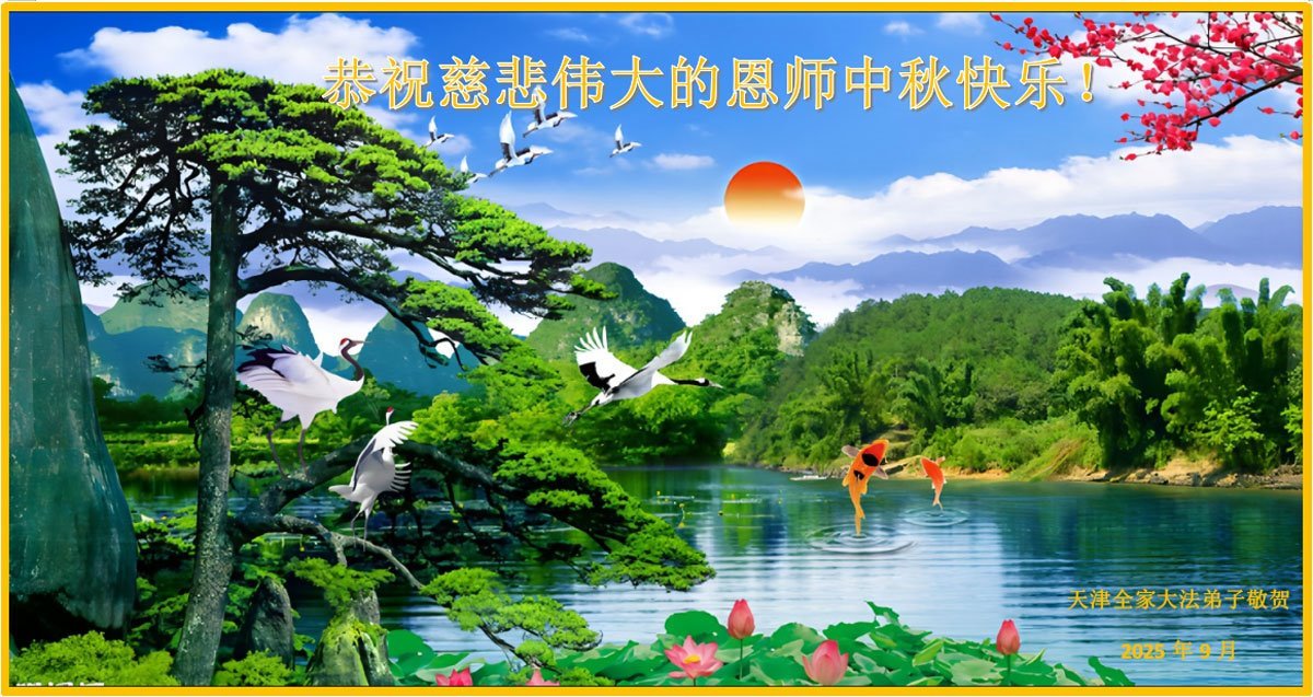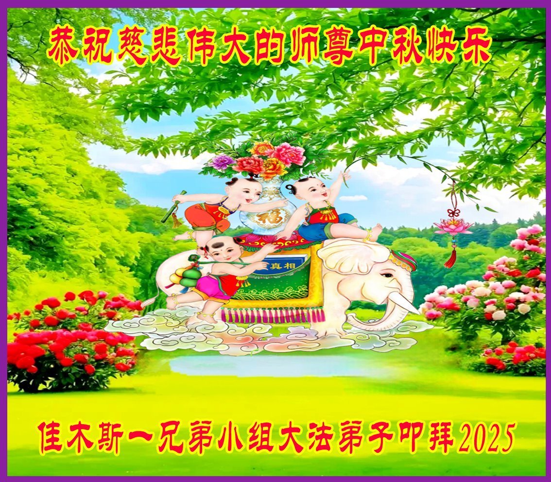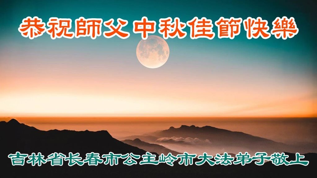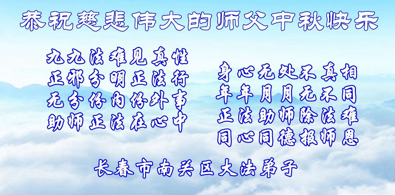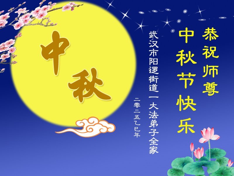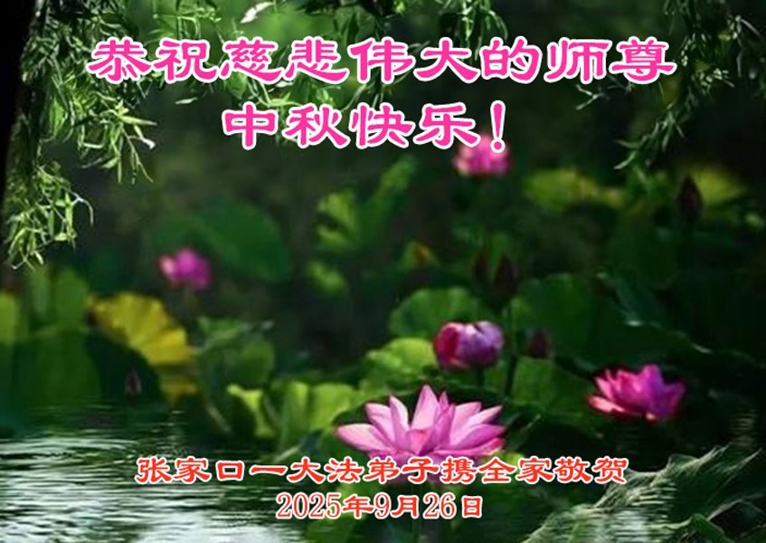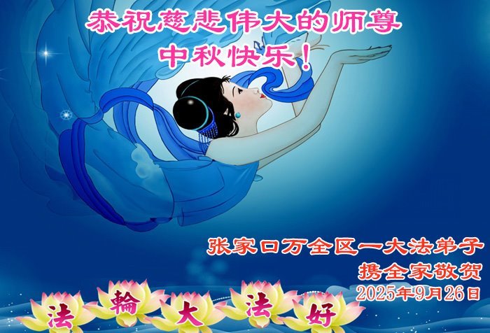 我们大法弟子携家人和明真相的世人恭祝师尊中秋节快乐!师尊辛苦了!谢谢师尊的慈悲苦度!弟子一定破除旧势力的安排,消除间隔,形成强大的整体,反迫害,救度众生。弟子们要多学法,学好法,发好正念,向内找,兑现自己的誓约,跟师父回家。