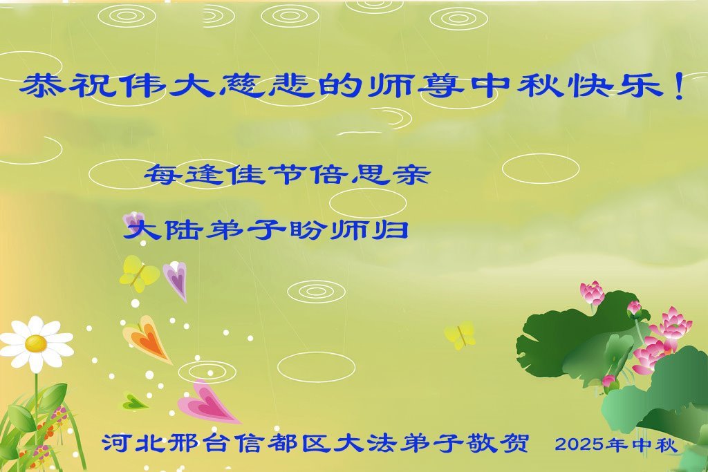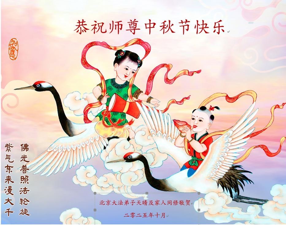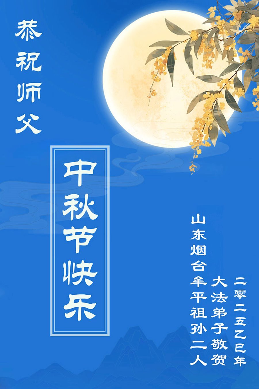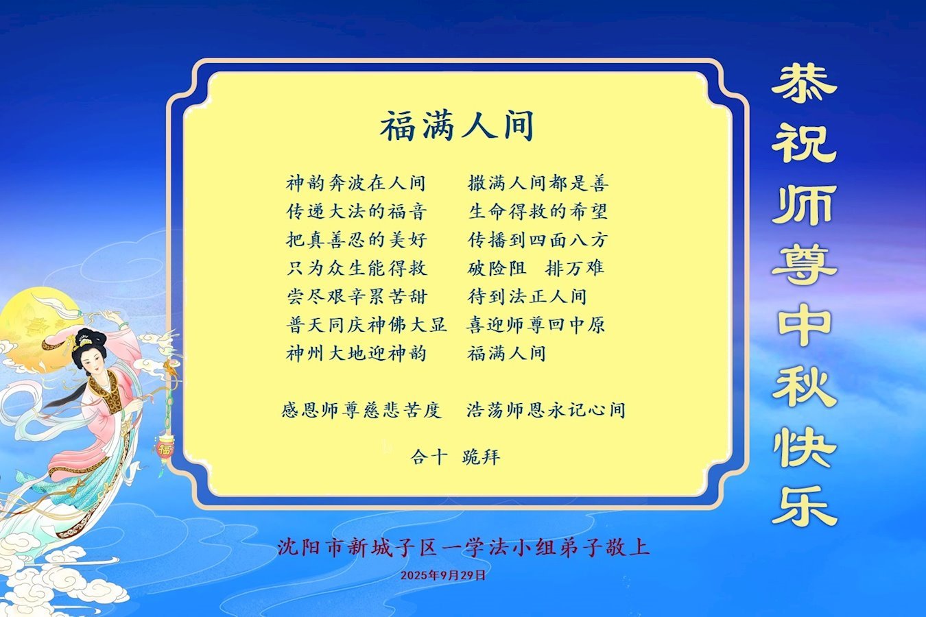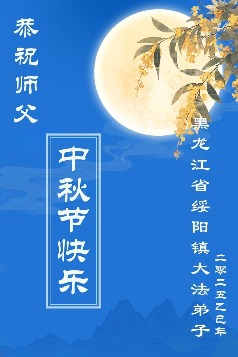 【明慧网二零二五年十月五日】(明慧网通讯员综合报道)海天一碧月儿圆,随师正法在人间。在这中秋佳节万家团圆的日子里,中国大陆各省市大法弟子们万分想念师父,感恩师父!感念师尊亲临世间传大法,赐予众生得救的万古机缘。不管未来的路是艰难还是平坦,弟子们都会义无反顾的紧随师尊,把阳光与希望洒向人间。