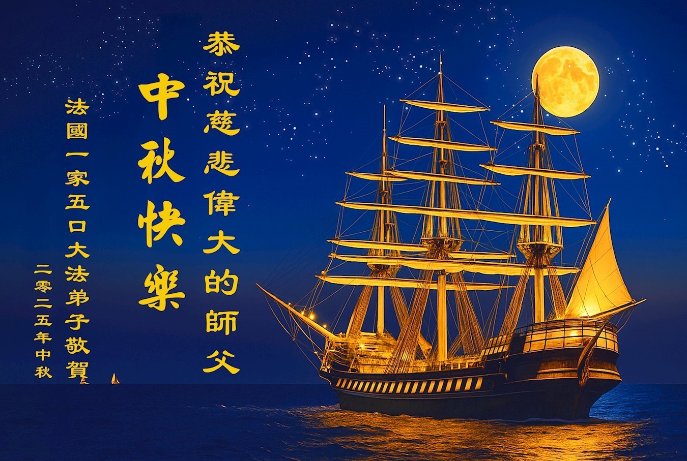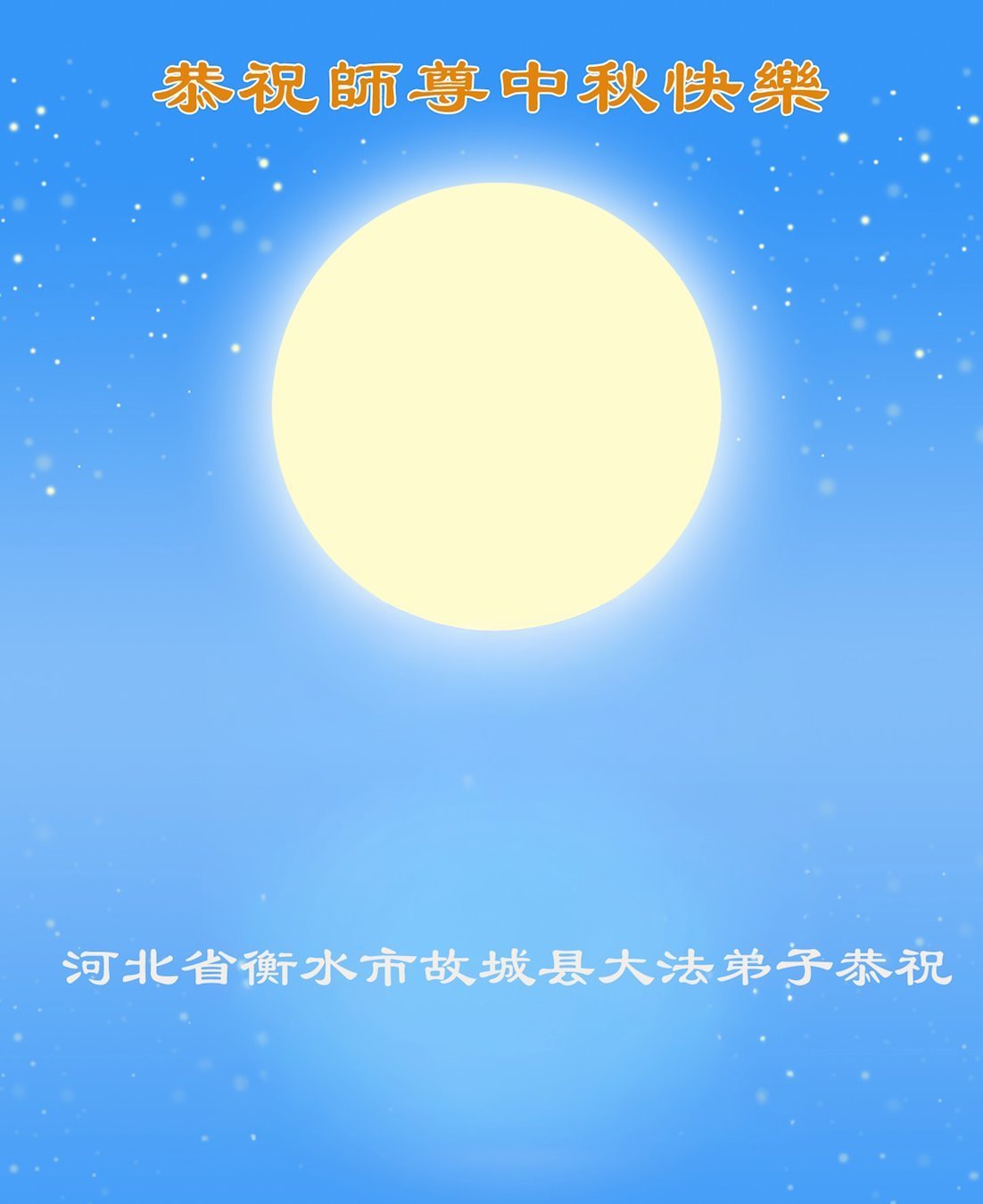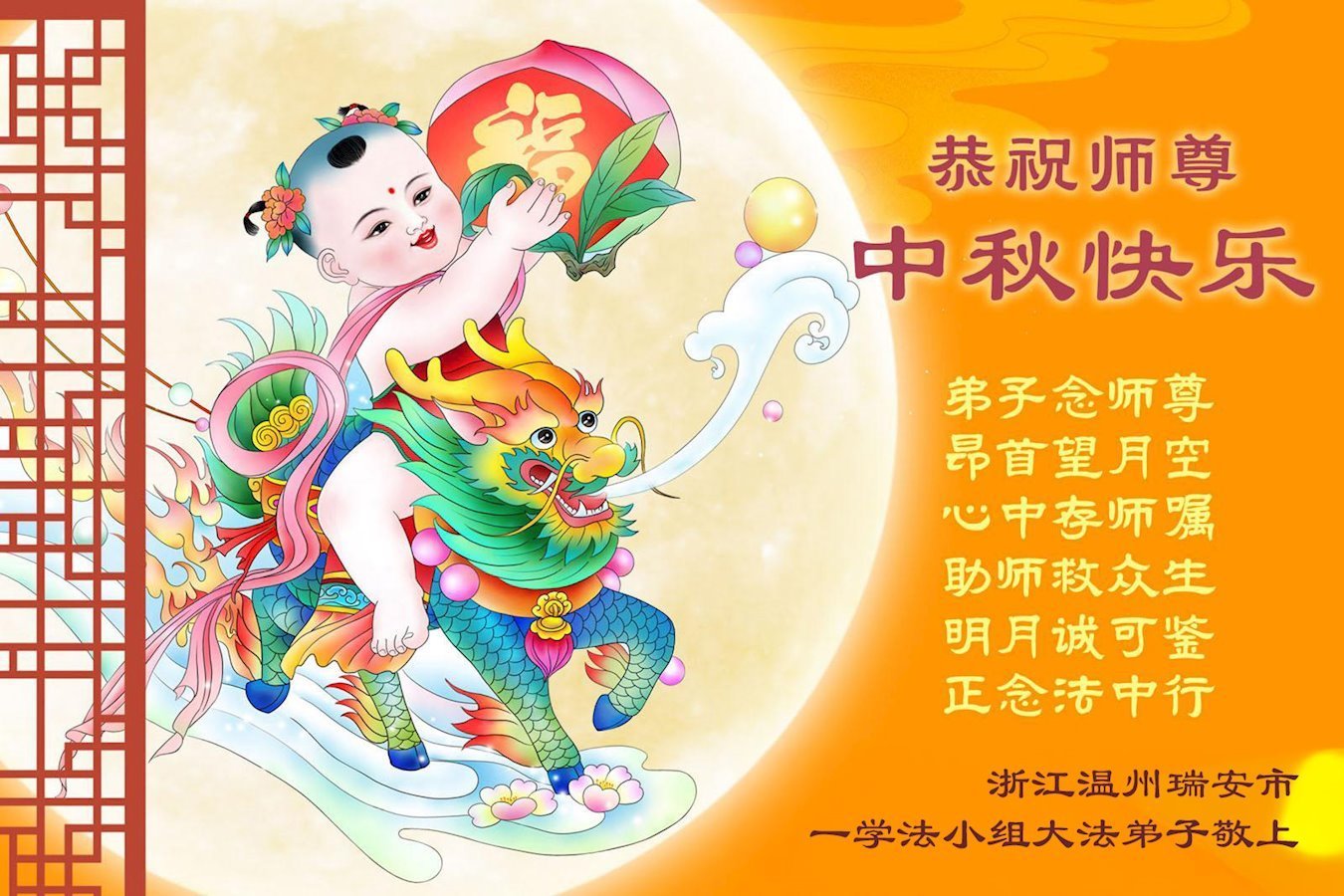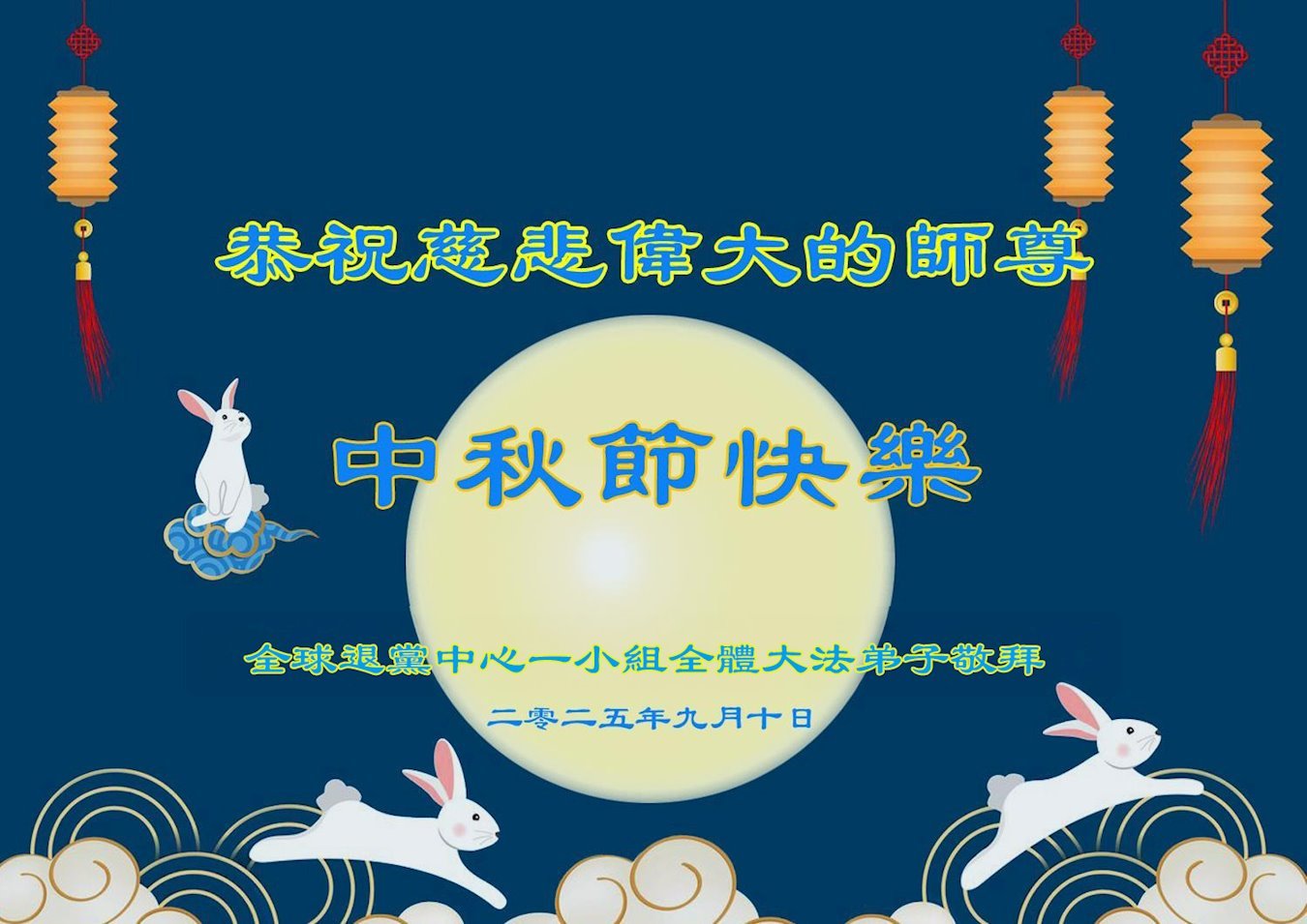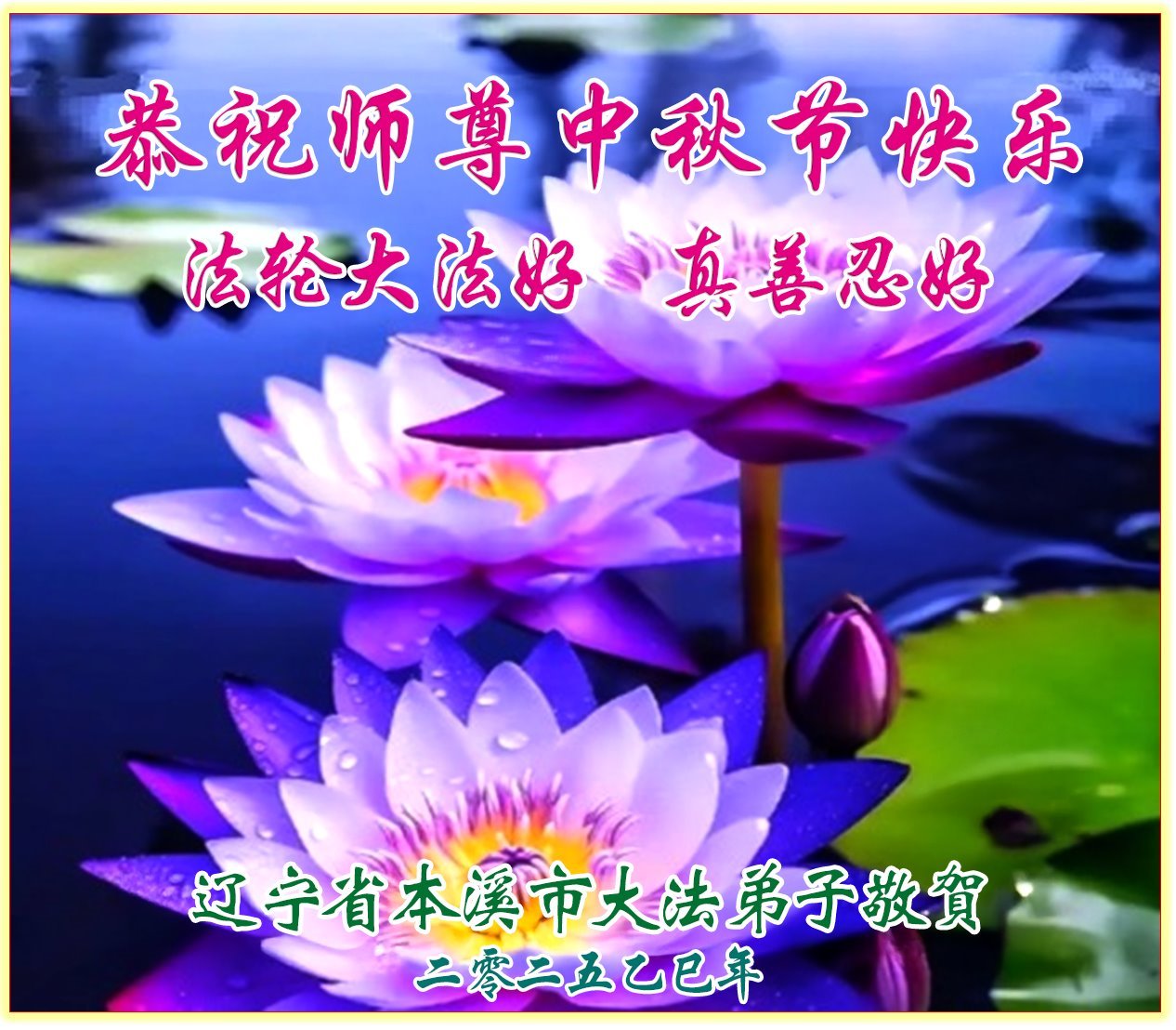 恭祝慈悲伟大的师父中秋节快乐!祝愿全体大法弟子在修炼中坚守誓言,助师救度众生,随师父一起回归真正的家园。(译文)