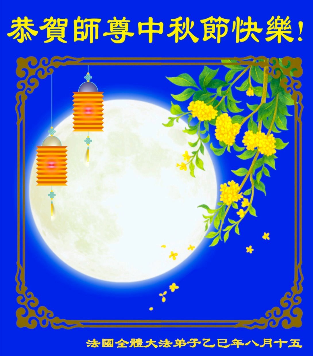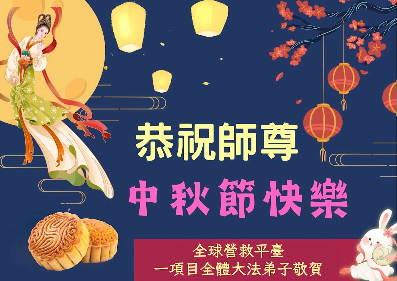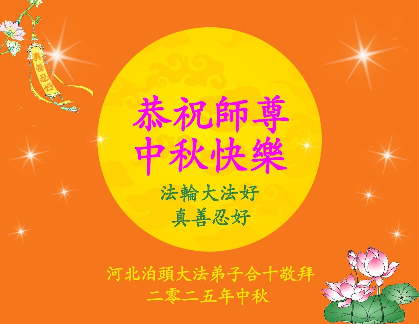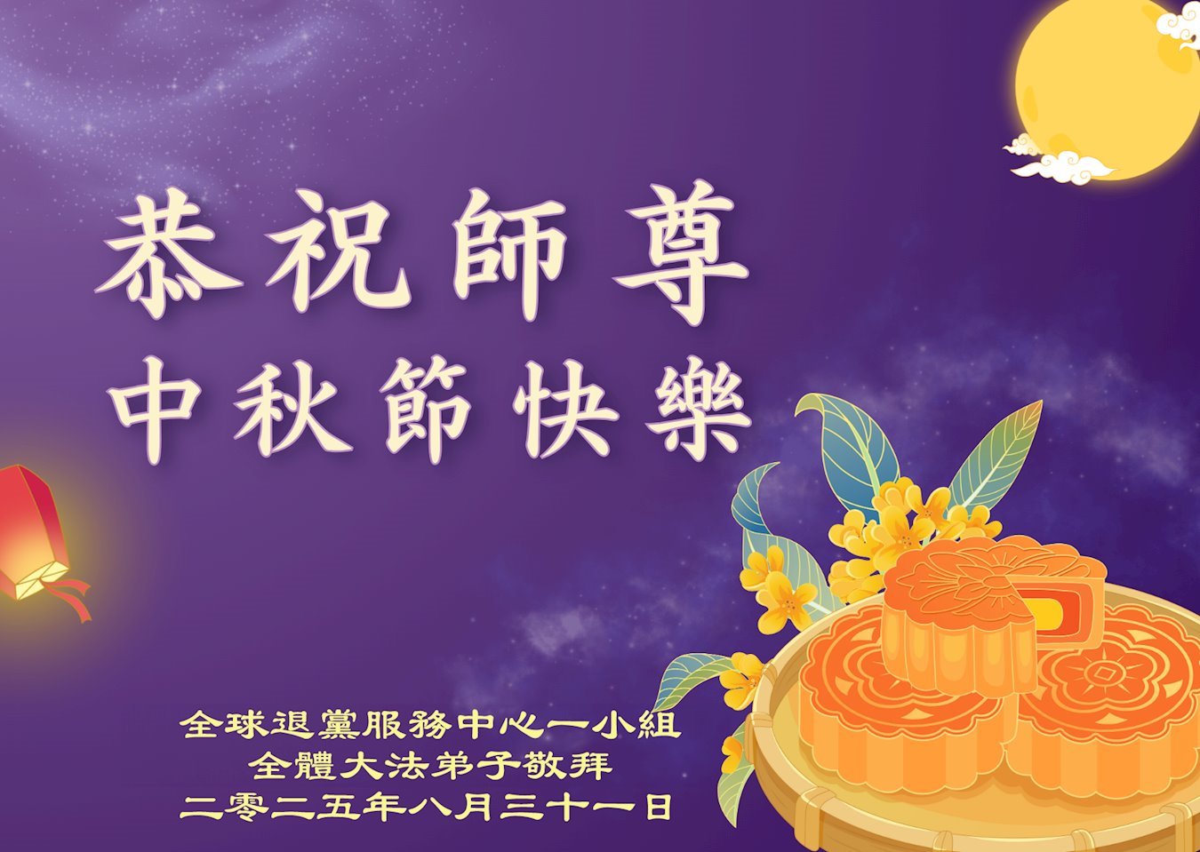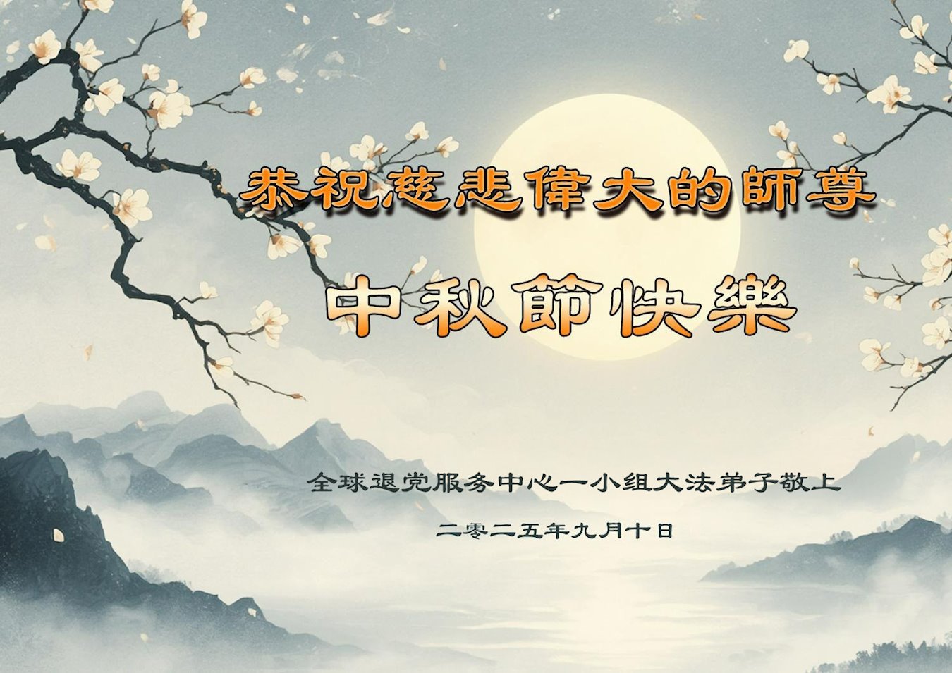 恭祝慈悲伟大的师父中秋节快乐!祝愿全体大法弟子在修炼中坚守誓言,助师救度众生,随师父一起回归真正的家园。(译文)