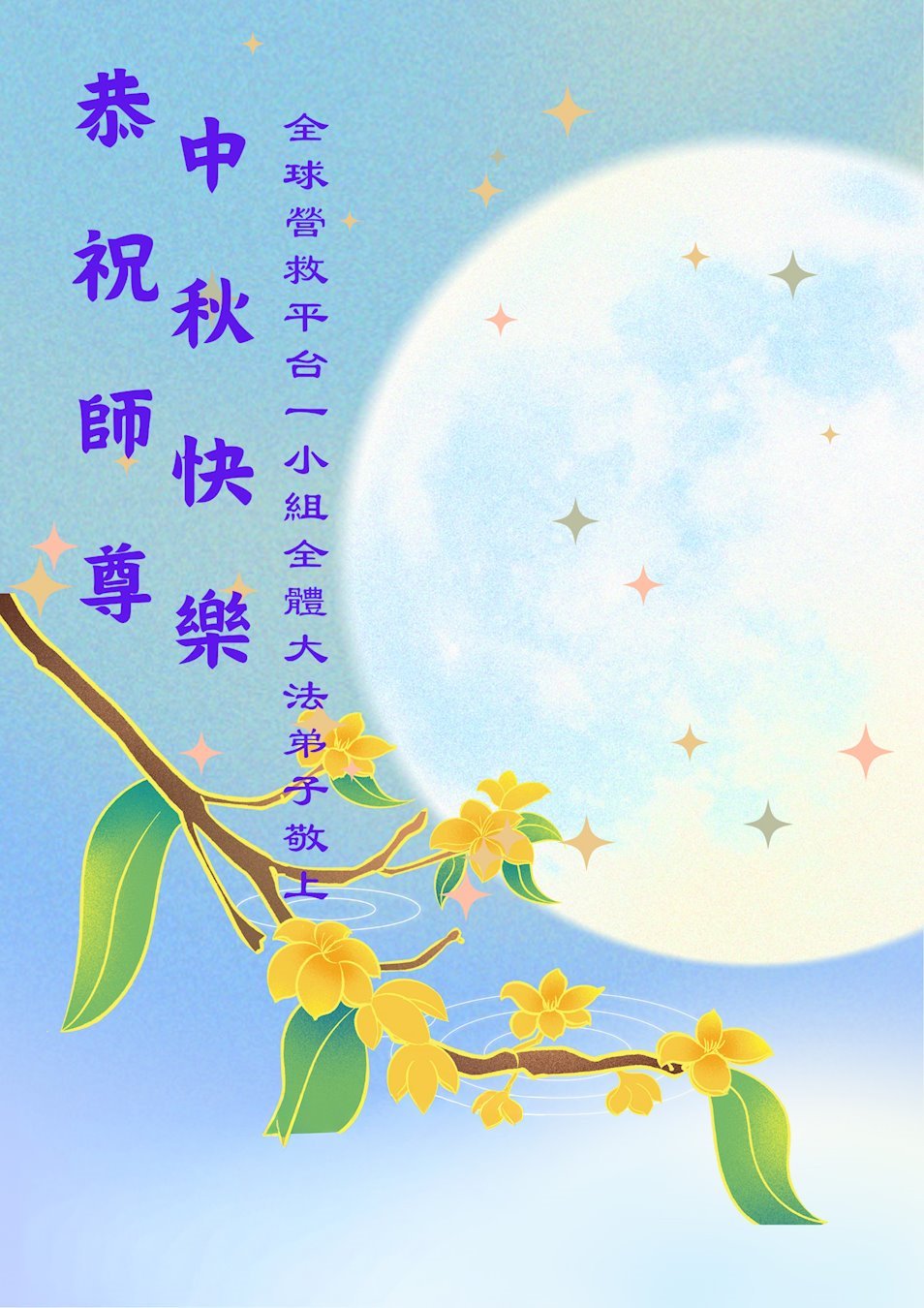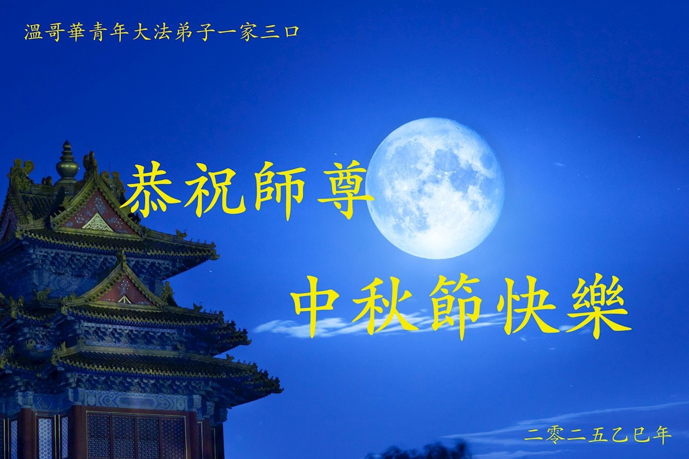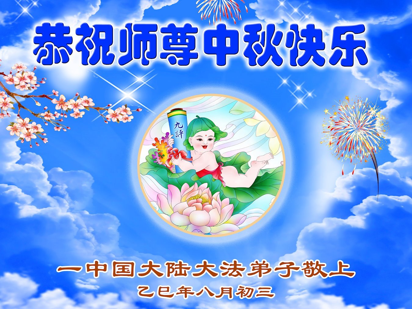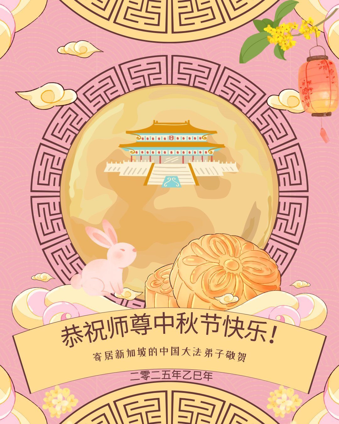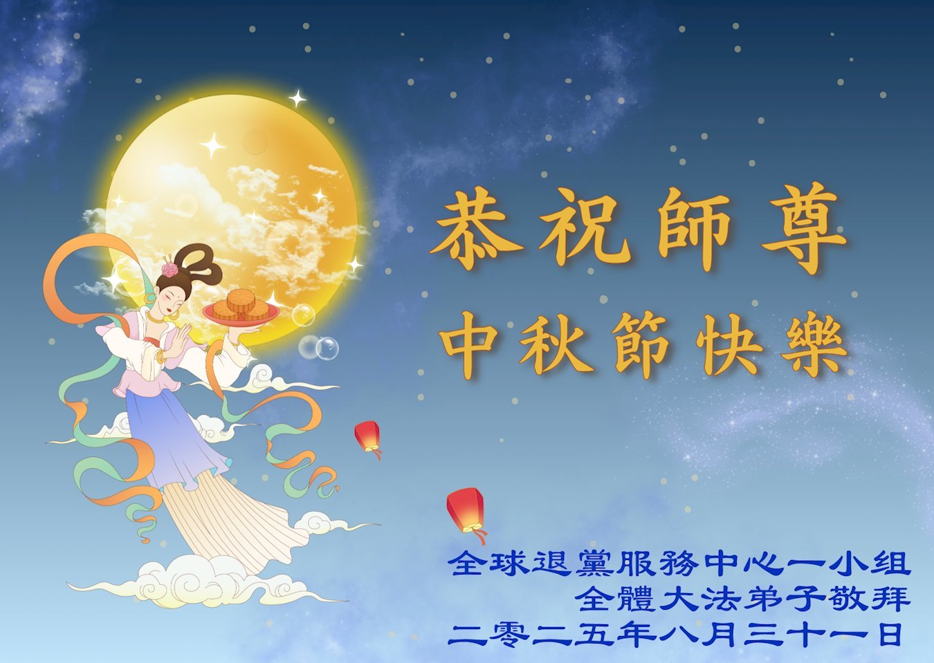恭祝慈悲伟大的师父中秋节快乐!祝愿全体大法弟子在修炼中坚守誓言,助师救度众生,随师父一起回归真正的家园。(译文)