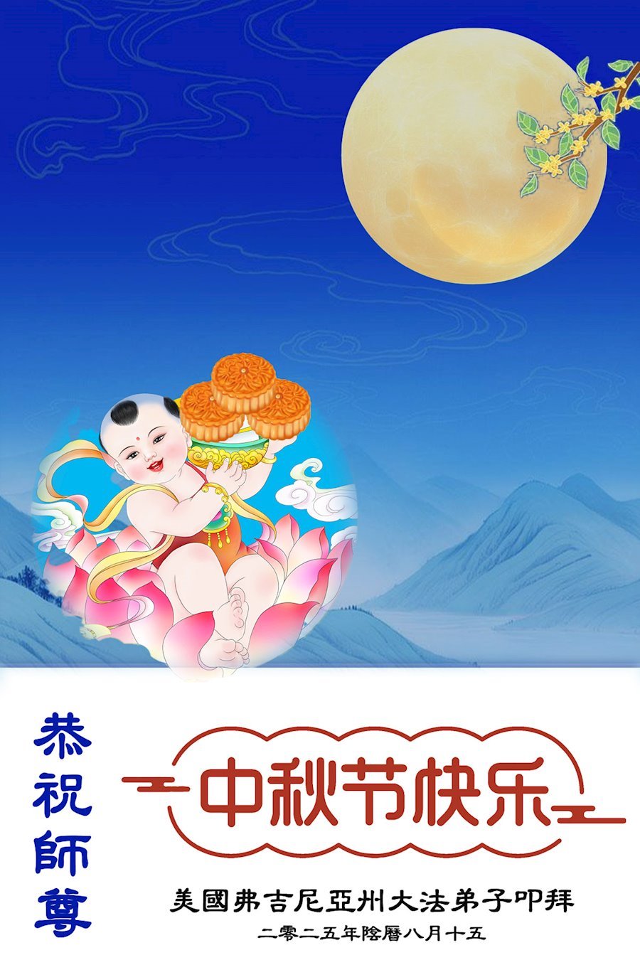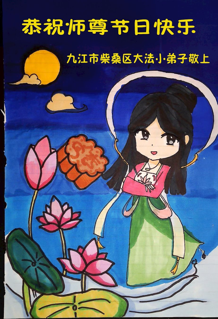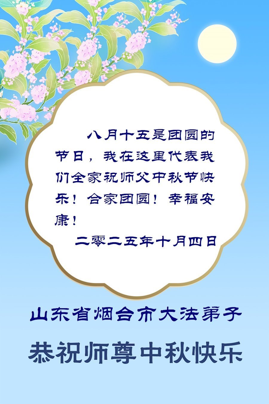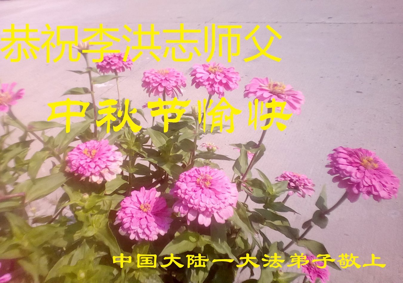 Dear and benevolent Master, I congratulate you on this Mid-Autumn Festival and wish that all Dafa disciples, including myself, remain true to our vows in our cultivation and in saving sentient beings, so that together with you, we may return to our true home。