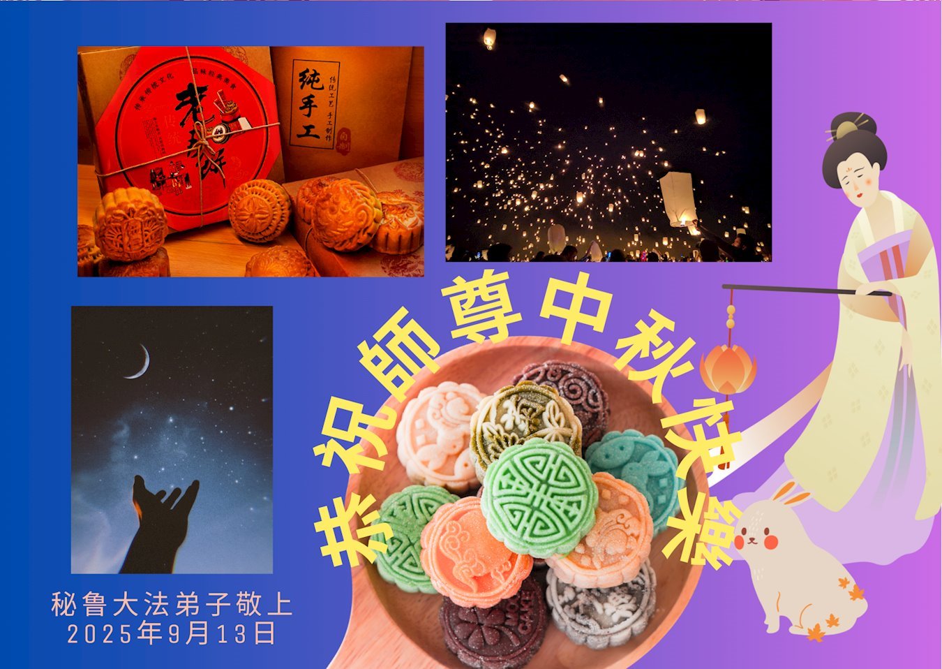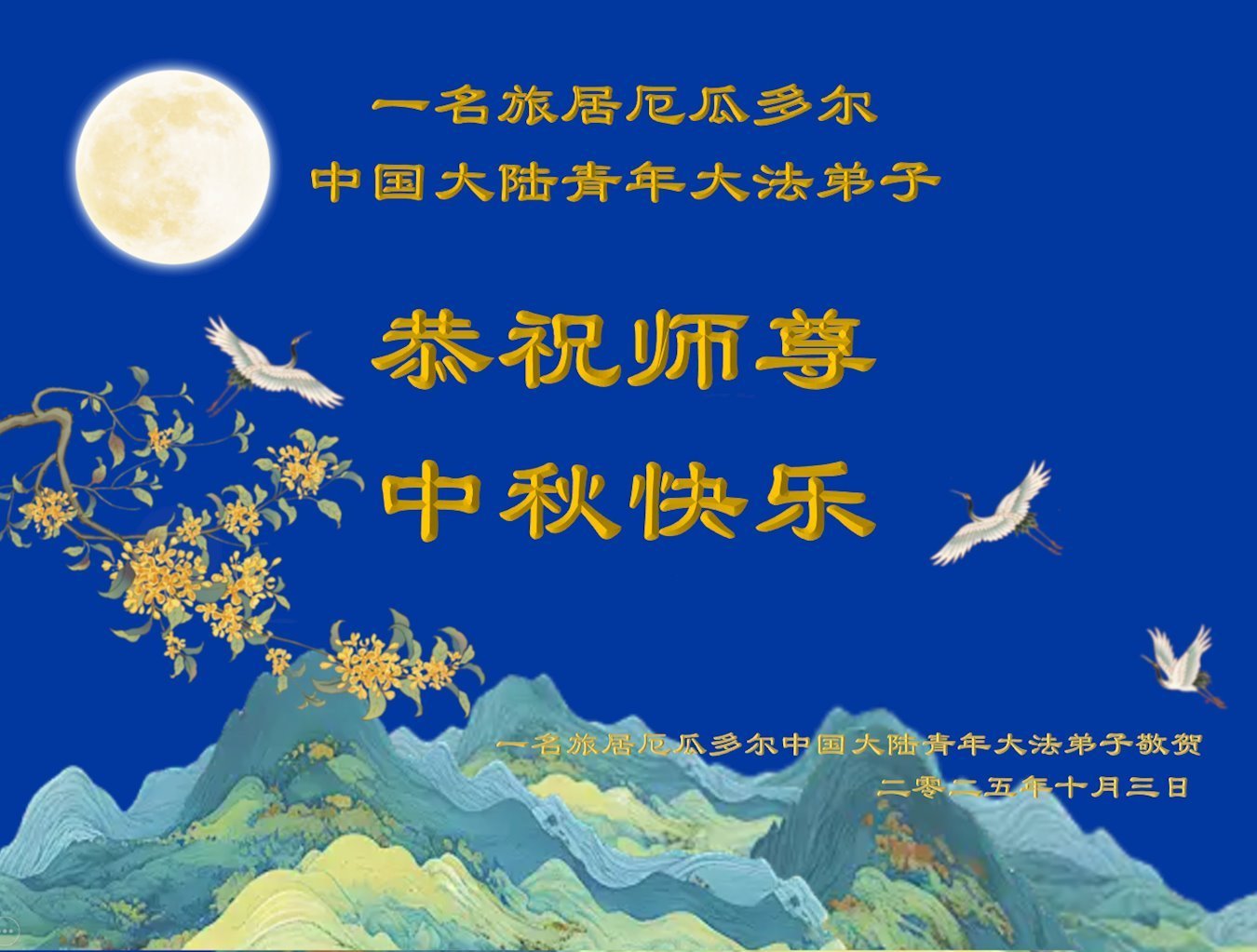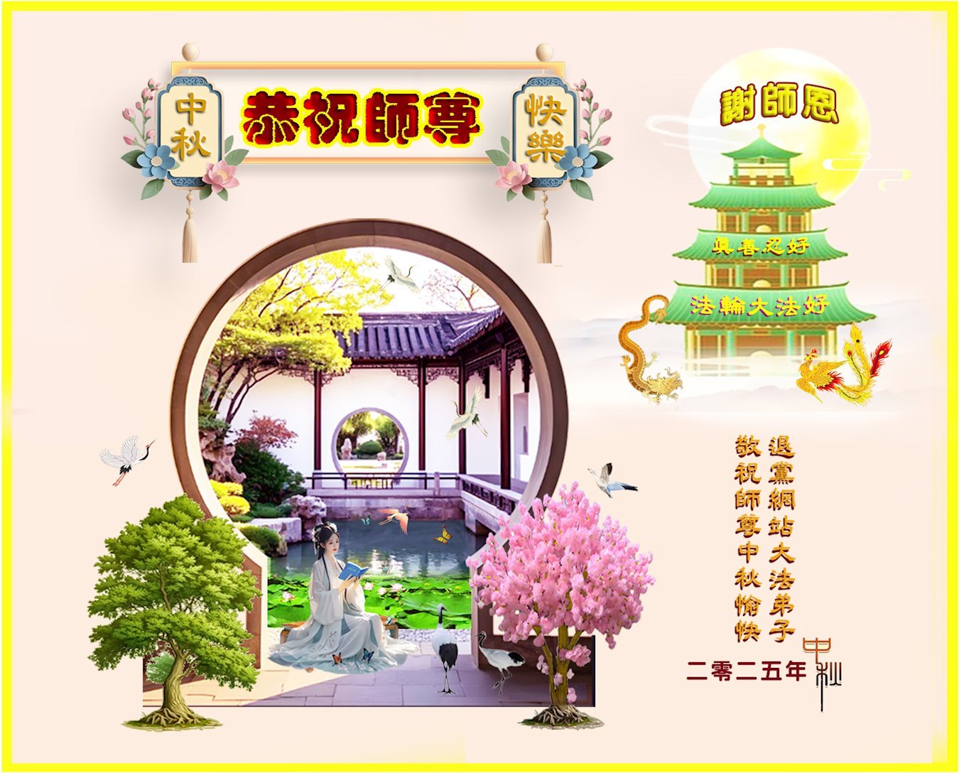 【明慧网二零二五年十月六日】在这合家团圆的中秋佳节,亿万大法弟子感恩师尊救度!大法弟子们时时感受到师尊的守护和指引,坚定的走在大法修炼之路上,不负师尊的嘱托,不负众生的期盼,走向美好的家园。