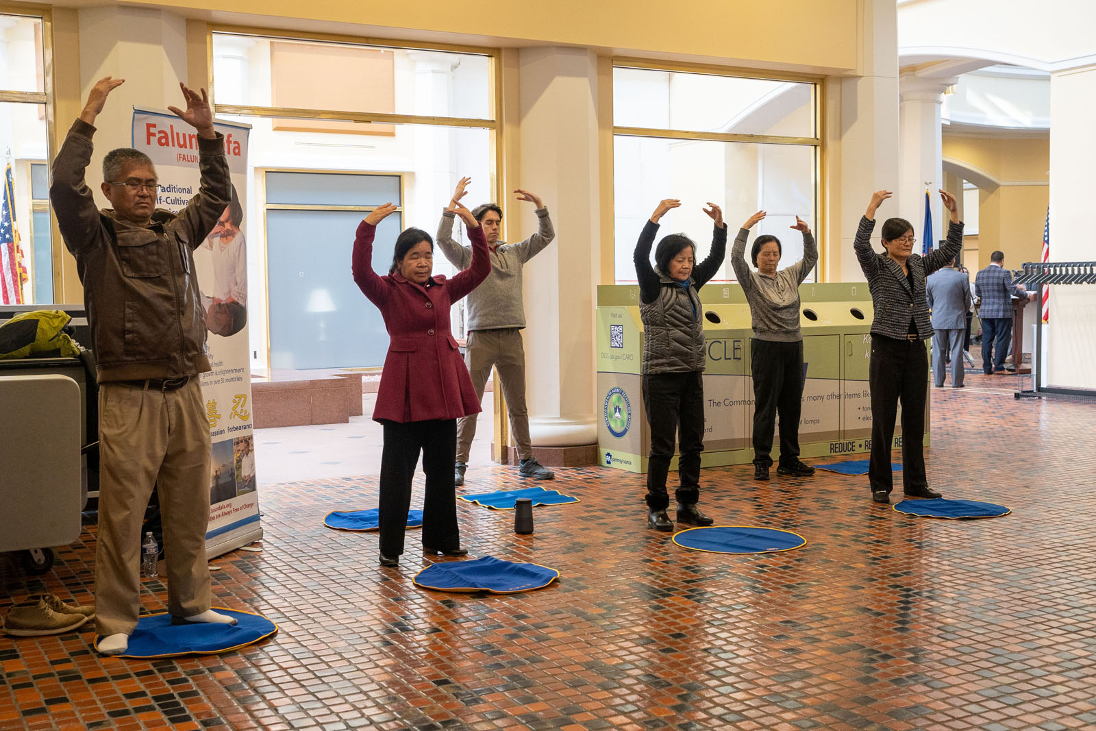 ![]() 图5:法轮功学员在宾州议会大厦举行的法轮大法宣传日活动上演示法轮功功法。 |