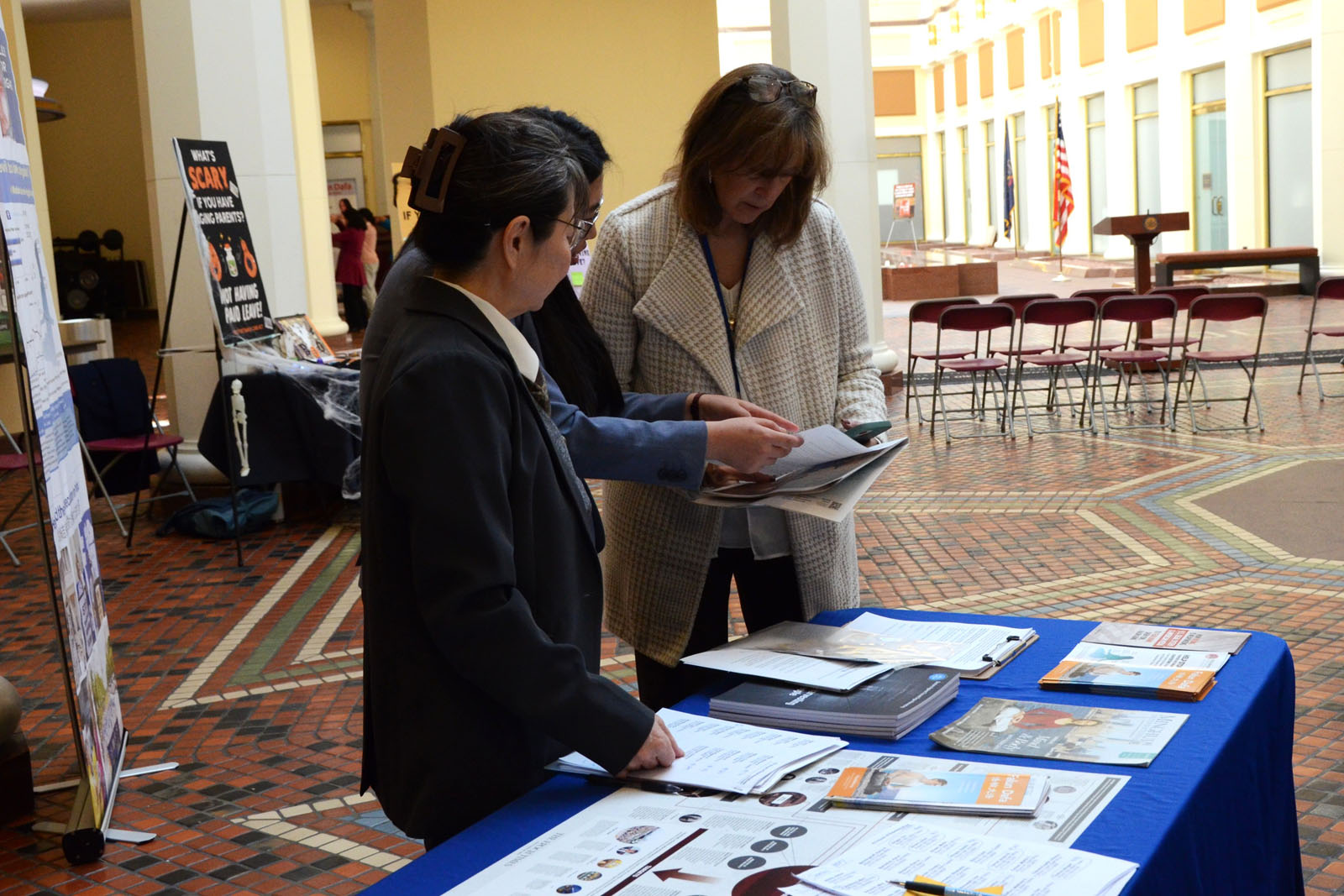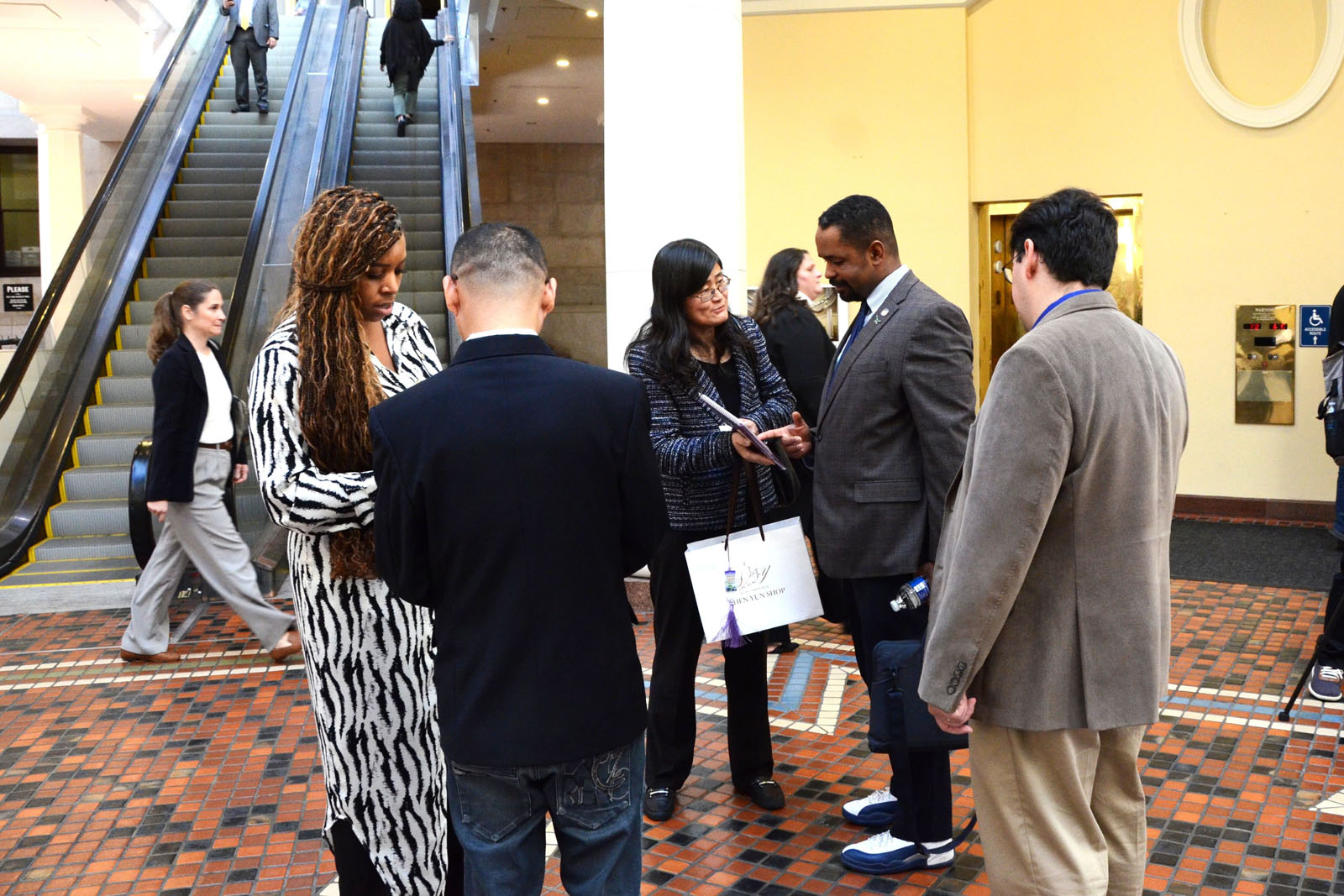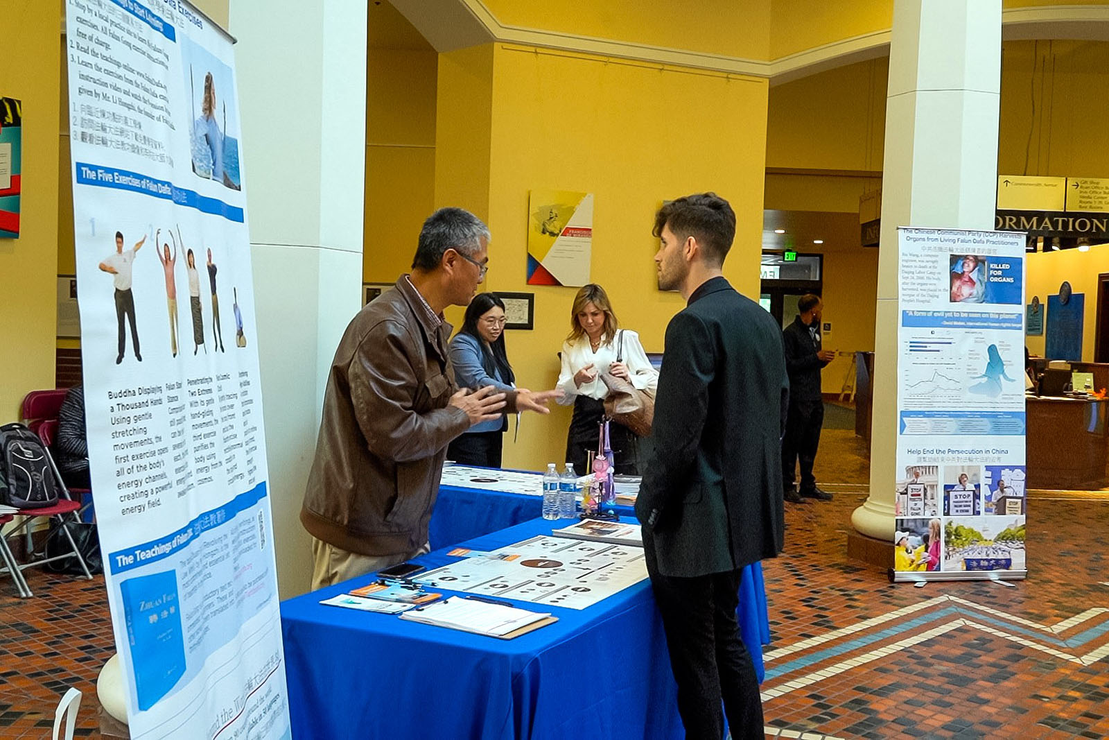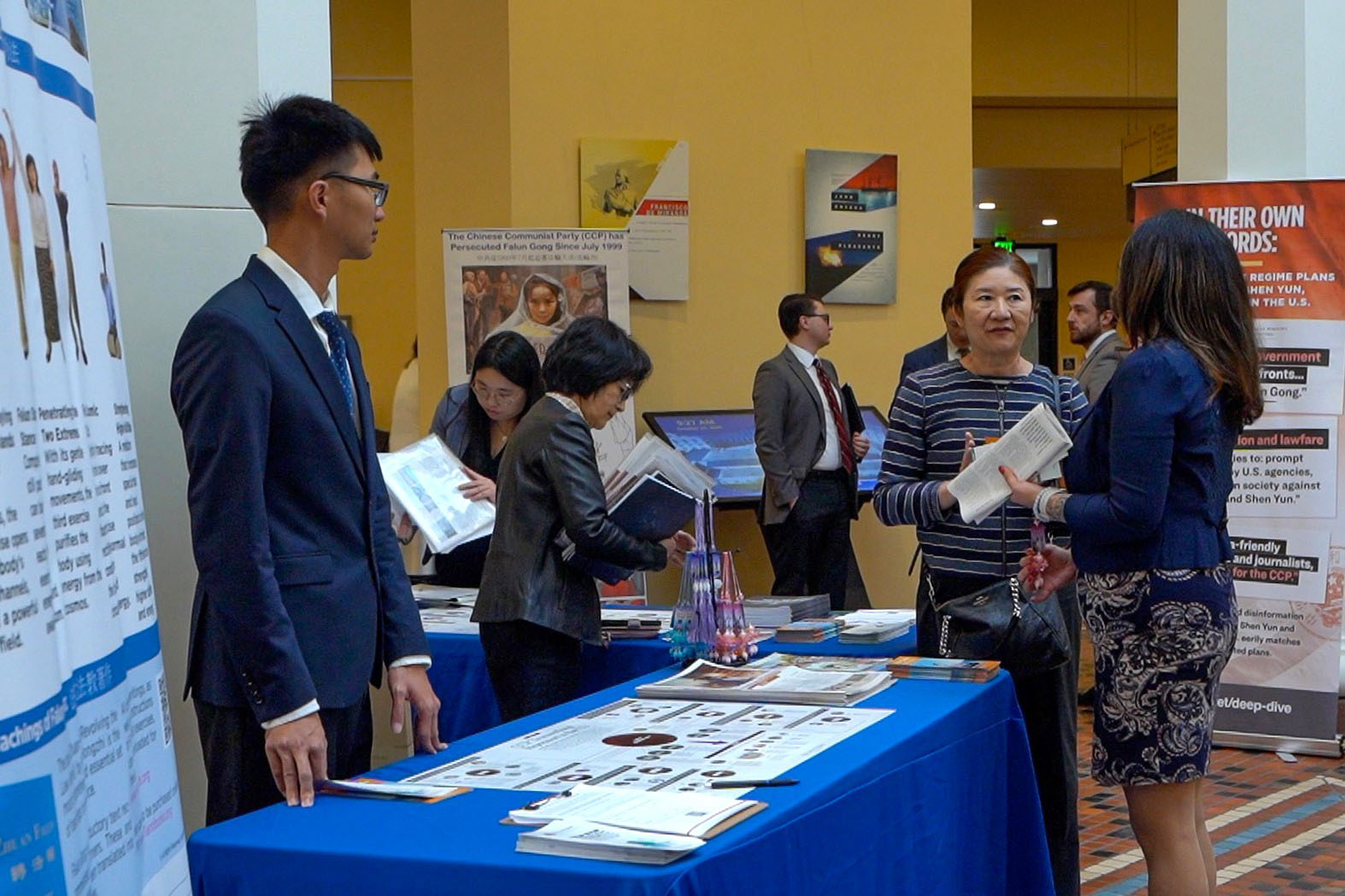 ![]() 图6~10:法轮功学员在美国宾州首府哈里斯堡的州议会大厦内举行的真相日活动中,向州政府人员讲法轮功真相。 |