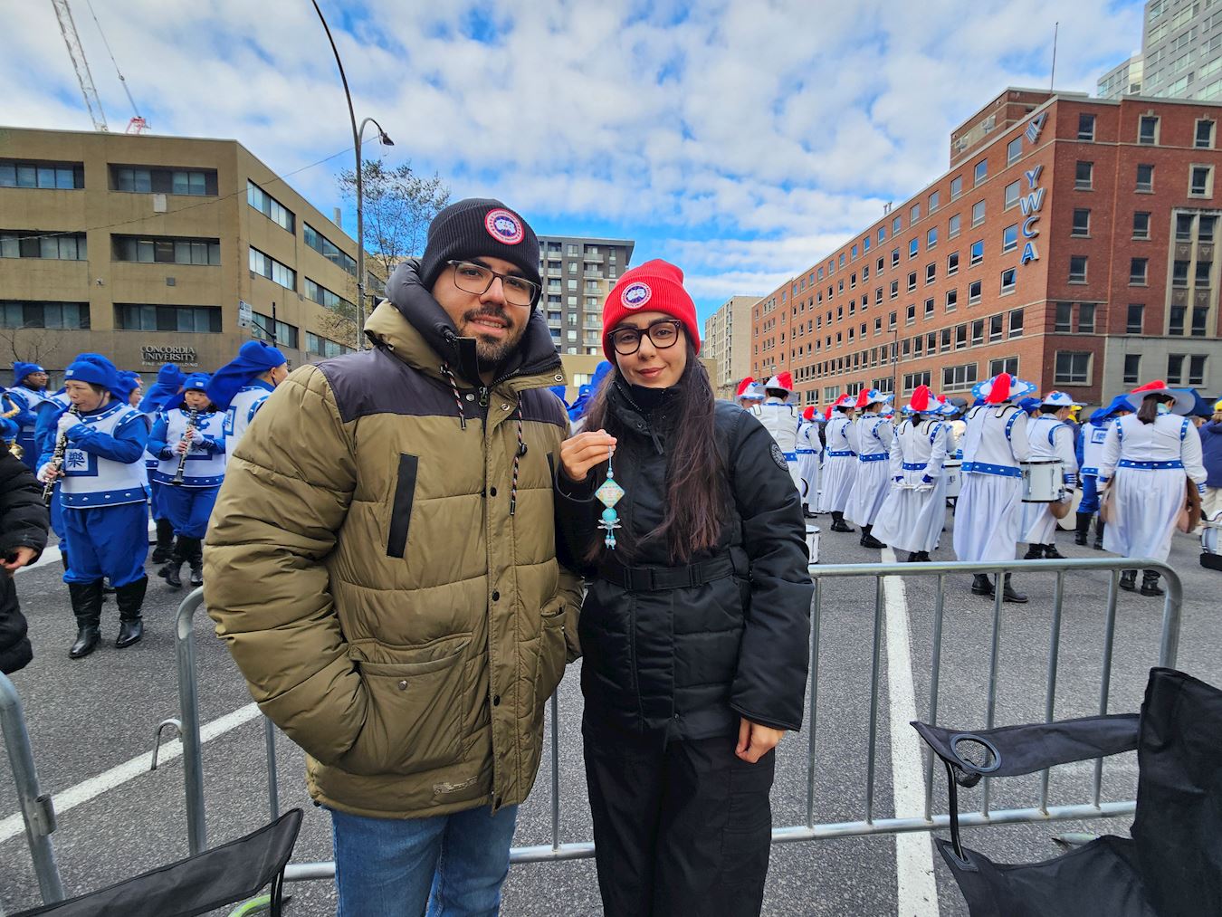 图1~2:二零二五年十一月月二十二日,法轮大法天国乐团在蒙特利尔圣诞游行上,受到盛赞。