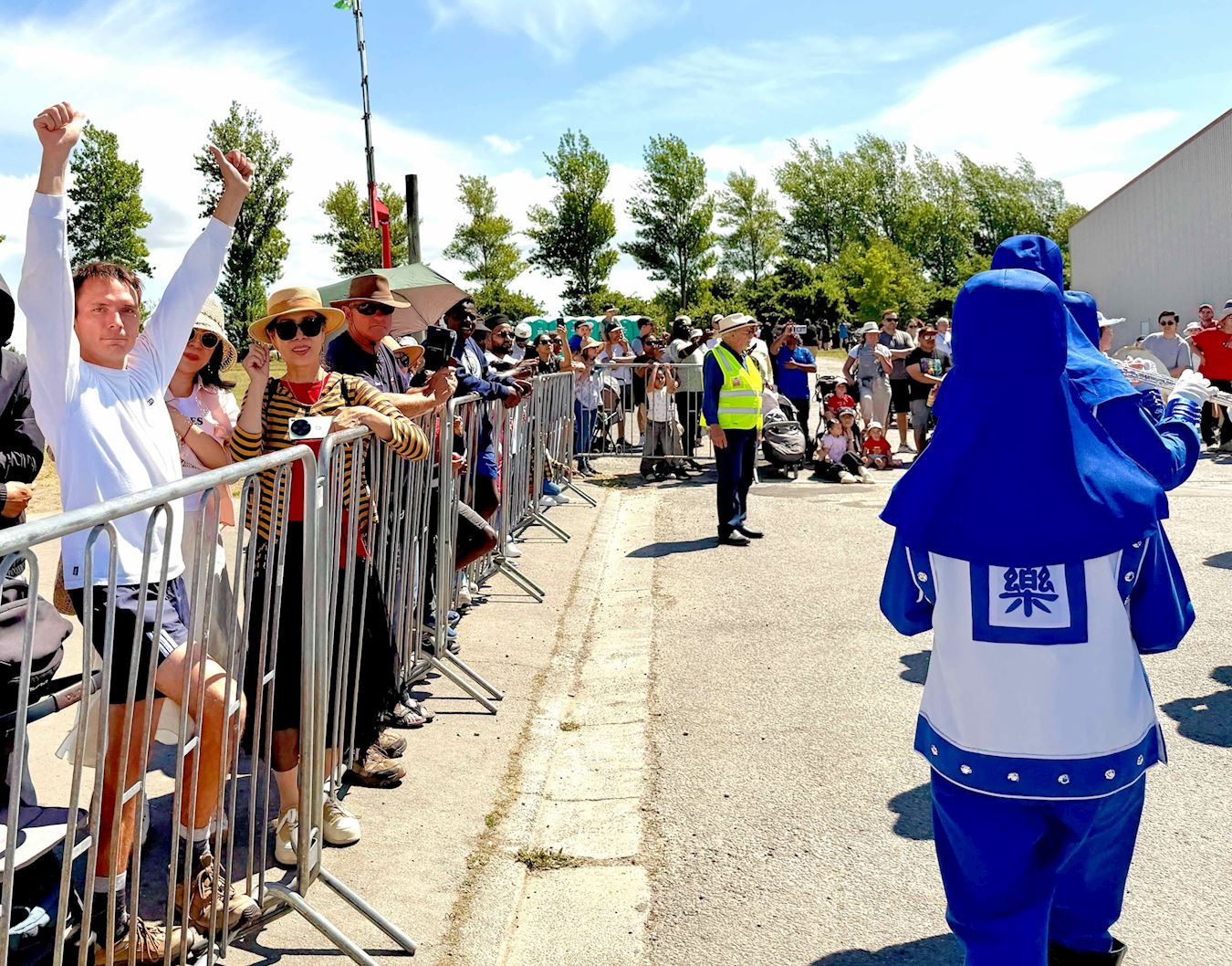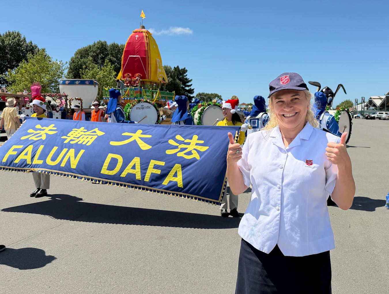 法轮大法团体以明亮的服饰、整齐的队形、雄壮的乐曲、灵动的表演,为现场观众带来一份平和美好的体验,也让真、善、忍的普世价值在节日气氛中温暖人心。他们每到之处,人们欢呼雀跃,鼓掌欢迎,有的人高高地竖起大拇指表示赞赏。