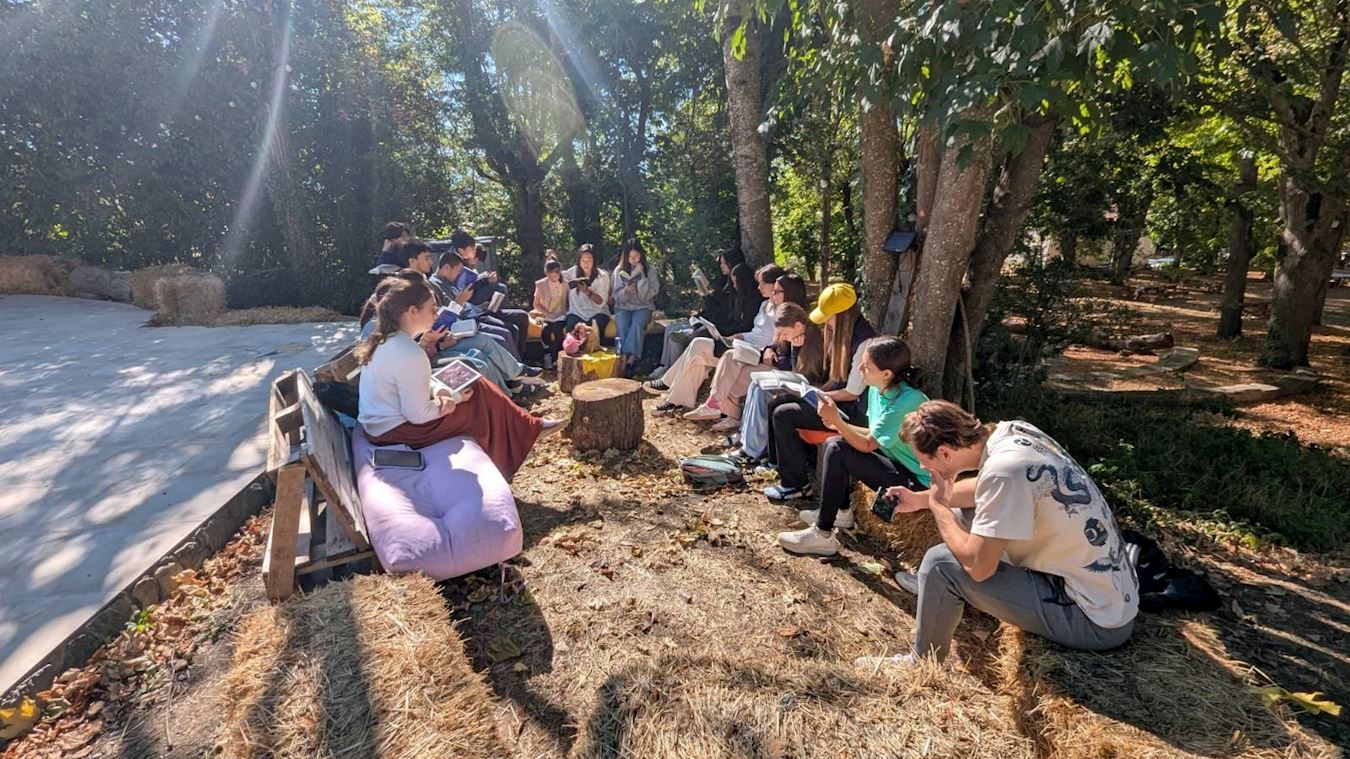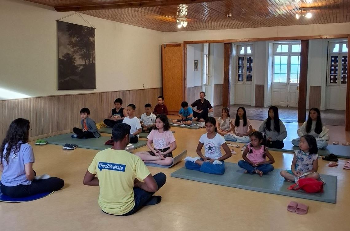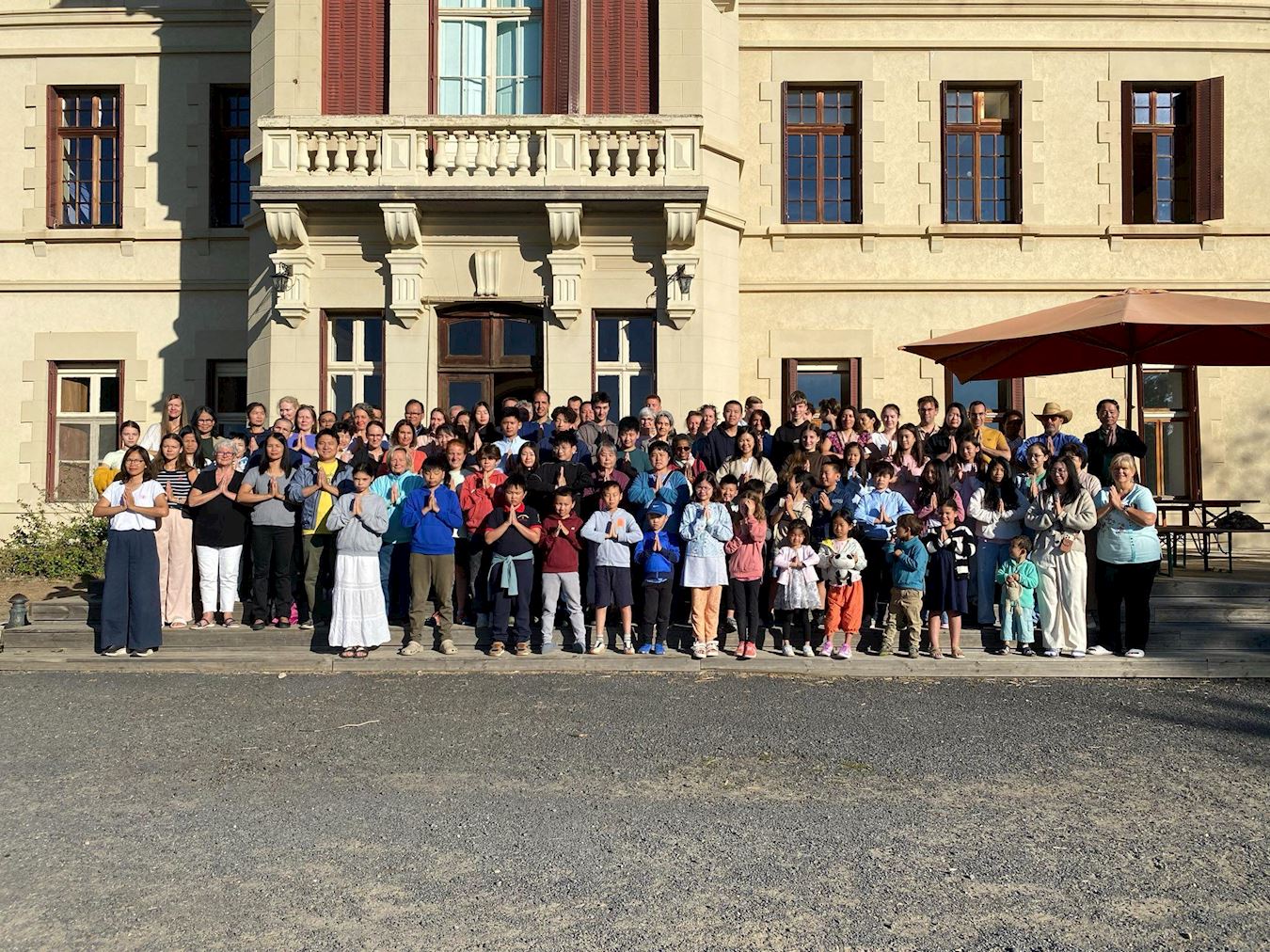 在阳光明媚的早晨,孩子们在城堡花园中认真撰写交流文章,并在全体营员面前庄重分享。无论是年长的青年还是几岁的幼童,都以恭敬平静的姿态聆听与表达。