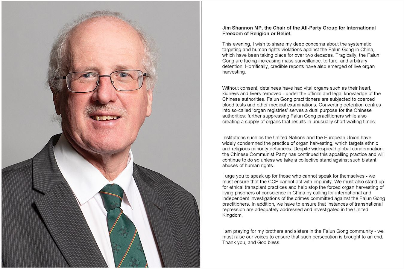 国际宗教或信仰自由跨党派议会小组(APPG for International Freedom of Religion or Belief)主席,吉姆·香农议员(Jim Shannon MP):