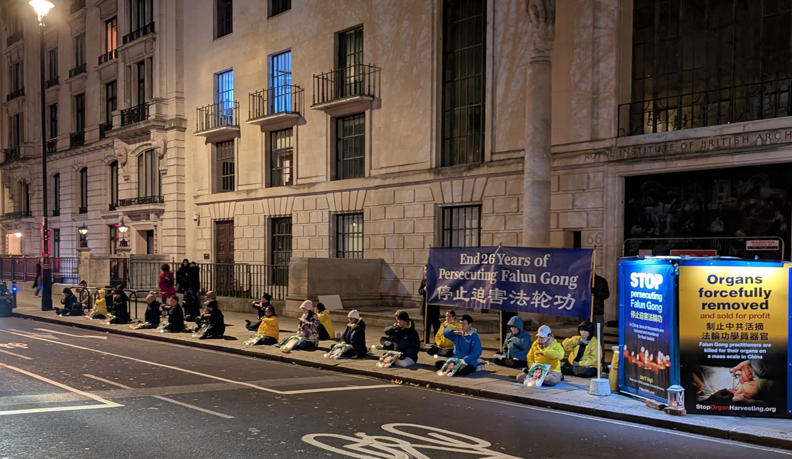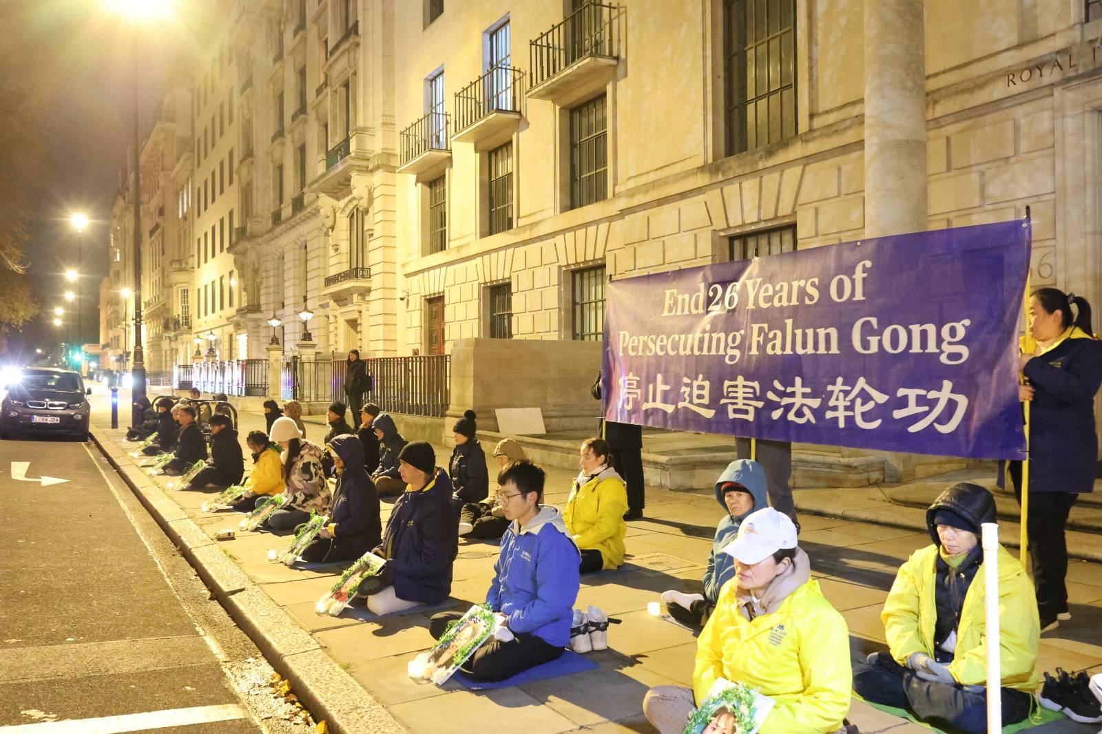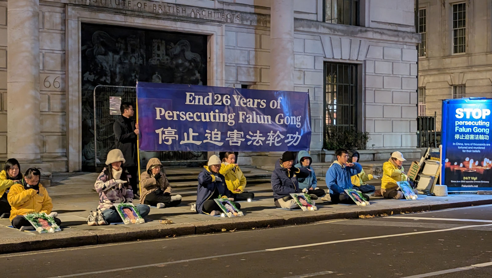 二零二五年十二月十日,国际人权日之际,英国部分法轮功学员聚集在伦敦中国驻英大使馆对面,举行烛光悼念,纪念被中共迫害致死的学员,并抗议中共对法轮功持续至今已逾二十六年的持续镇压和人权迫害 。