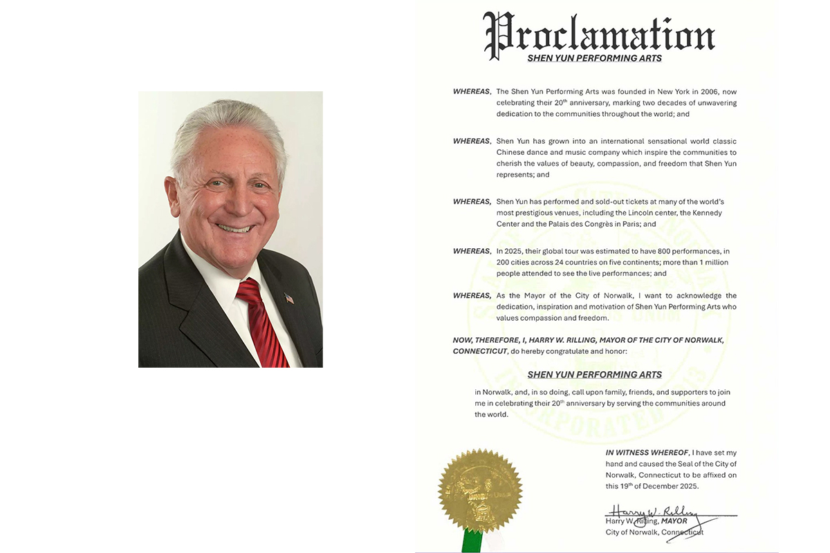 “鉴于此,本人——康涅狄格州诺沃克市市长哈里·W·里林,在此向神韵艺术团致以祝贺与敬意,同时,呼吁(他们的)家人、朋友和支持者与我一同庆祝神韵服务全球社区20周年。
