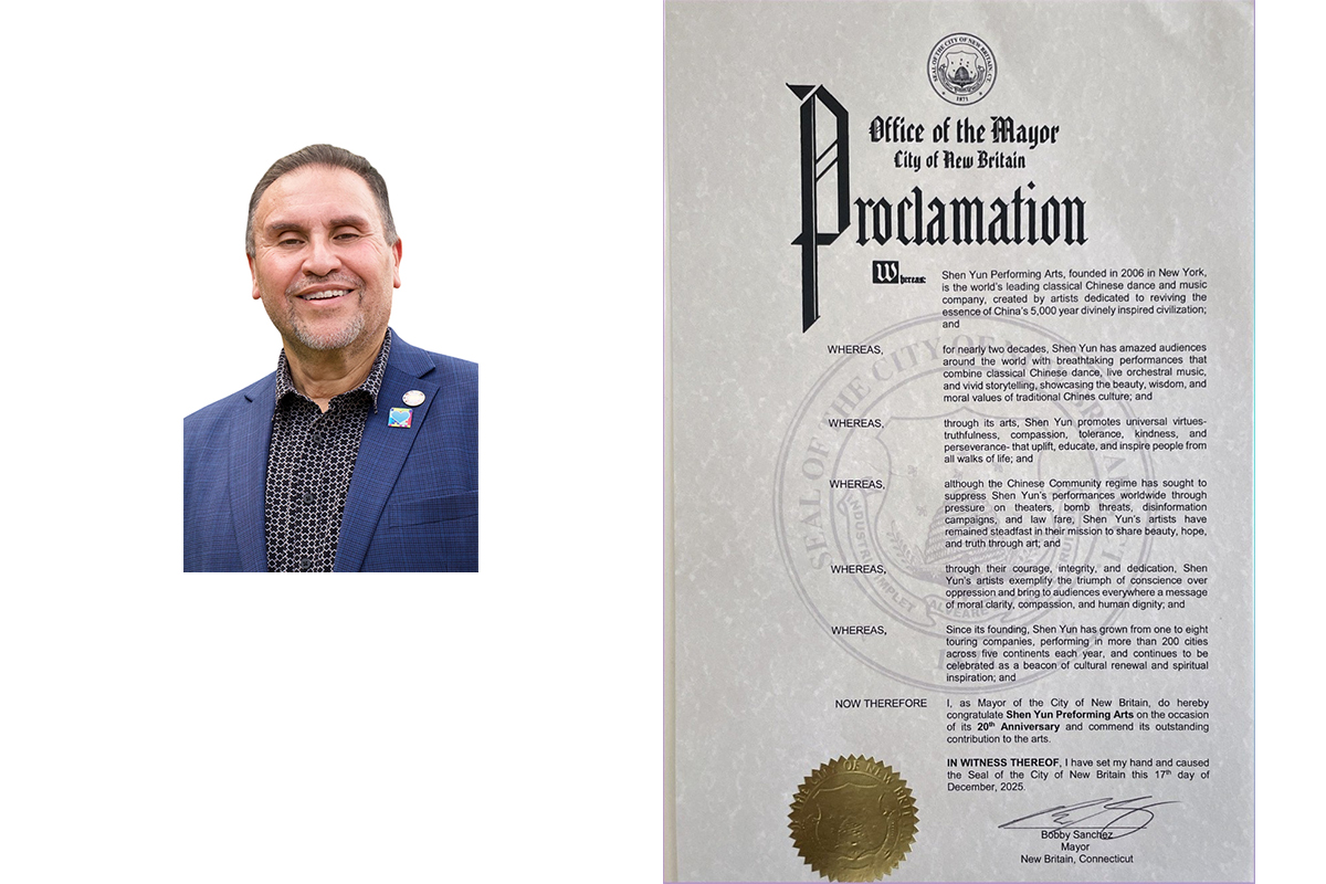 适逢神韵艺术团创立二十周年,并开启新一轮全球巡回演出之际,康州六座城市——沃特伯里(Waterbury)、斯坦福(Stamford)、诺沃克(Norwalk)、纽不列颠(New Britain)、布里斯托尔(Bristol)及纽伦敦(New London)——的市长先后向神韵艺术团颁发褒奖证书或嘉奖令,欢迎这台世界顶级艺术演出再次光临康州,敬贺神韵二十年来为复兴中华传统文化、启迪世道人心所作出的杰出贡献。