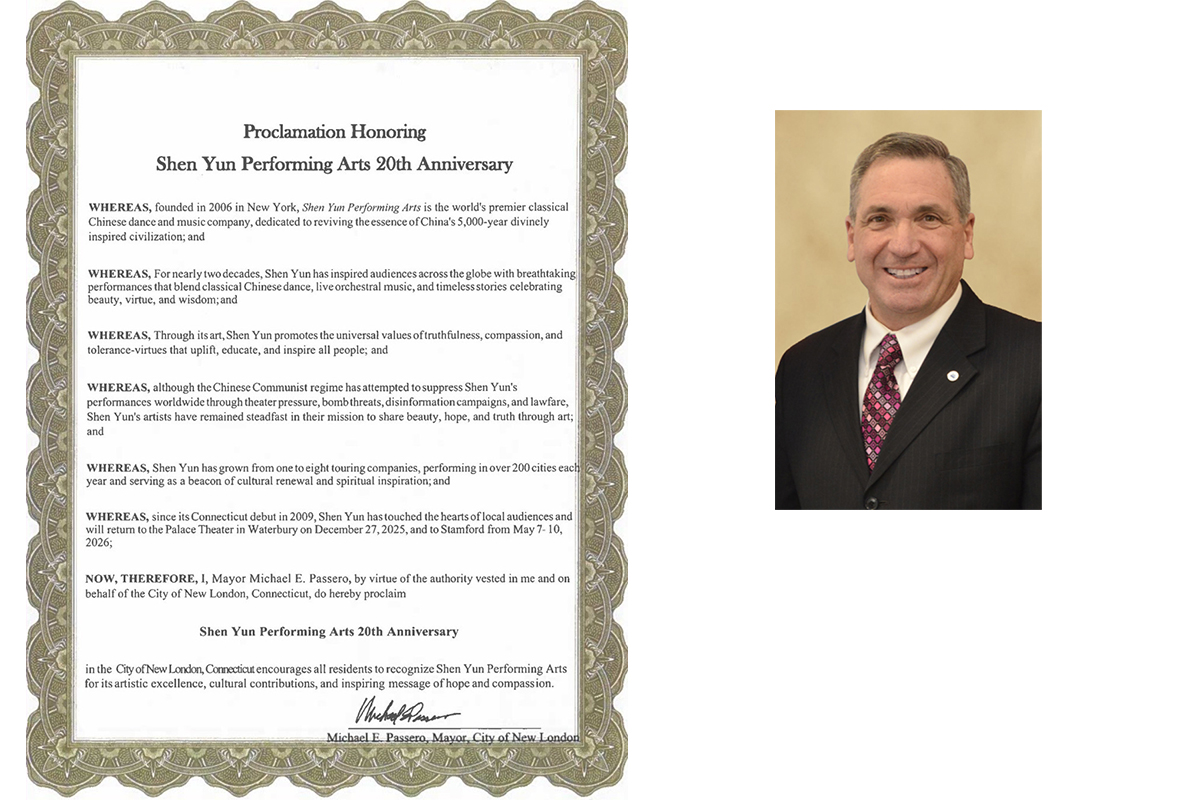 “康州纽伦敦市鼓励所有居民赞赏神韵艺术团的卓越艺术成就、文化贡献,以及鼓舞人心的希望与慈悲主题讯息。”