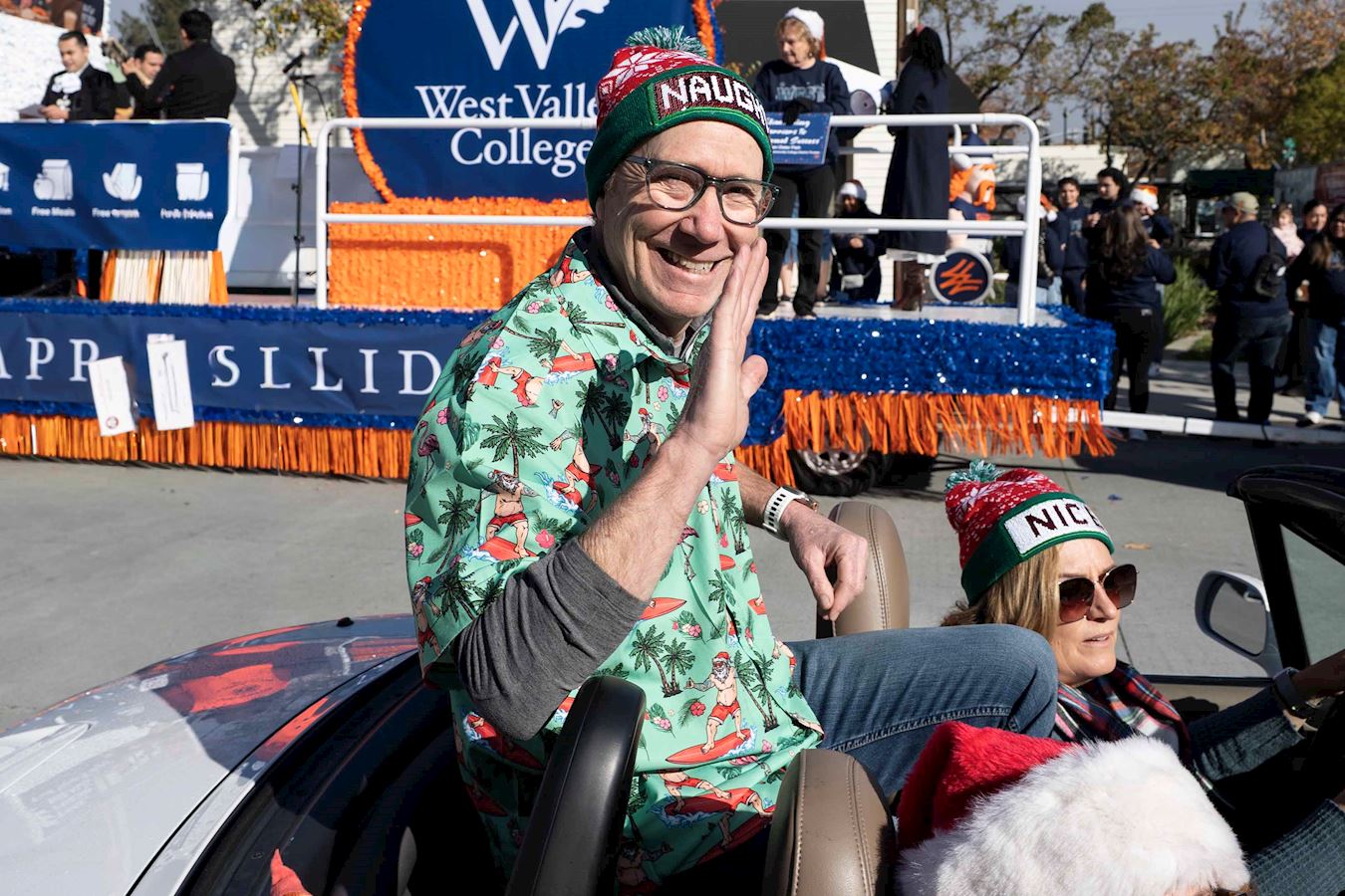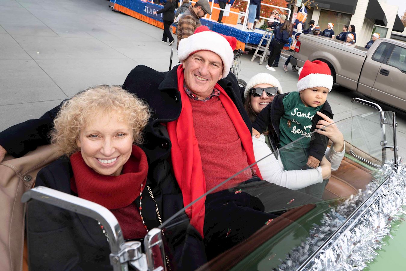 洛斯加托斯市议员罗布·雷尼(Rob Rennie)和家人都穿着节日的盛装,坐在敞篷车里参加游行。雷尼说,“感谢你们参加游行,虽然我还没有看见你们的队伍,但我期待看到你们的队伍,谢谢你们来这里参加游行。”