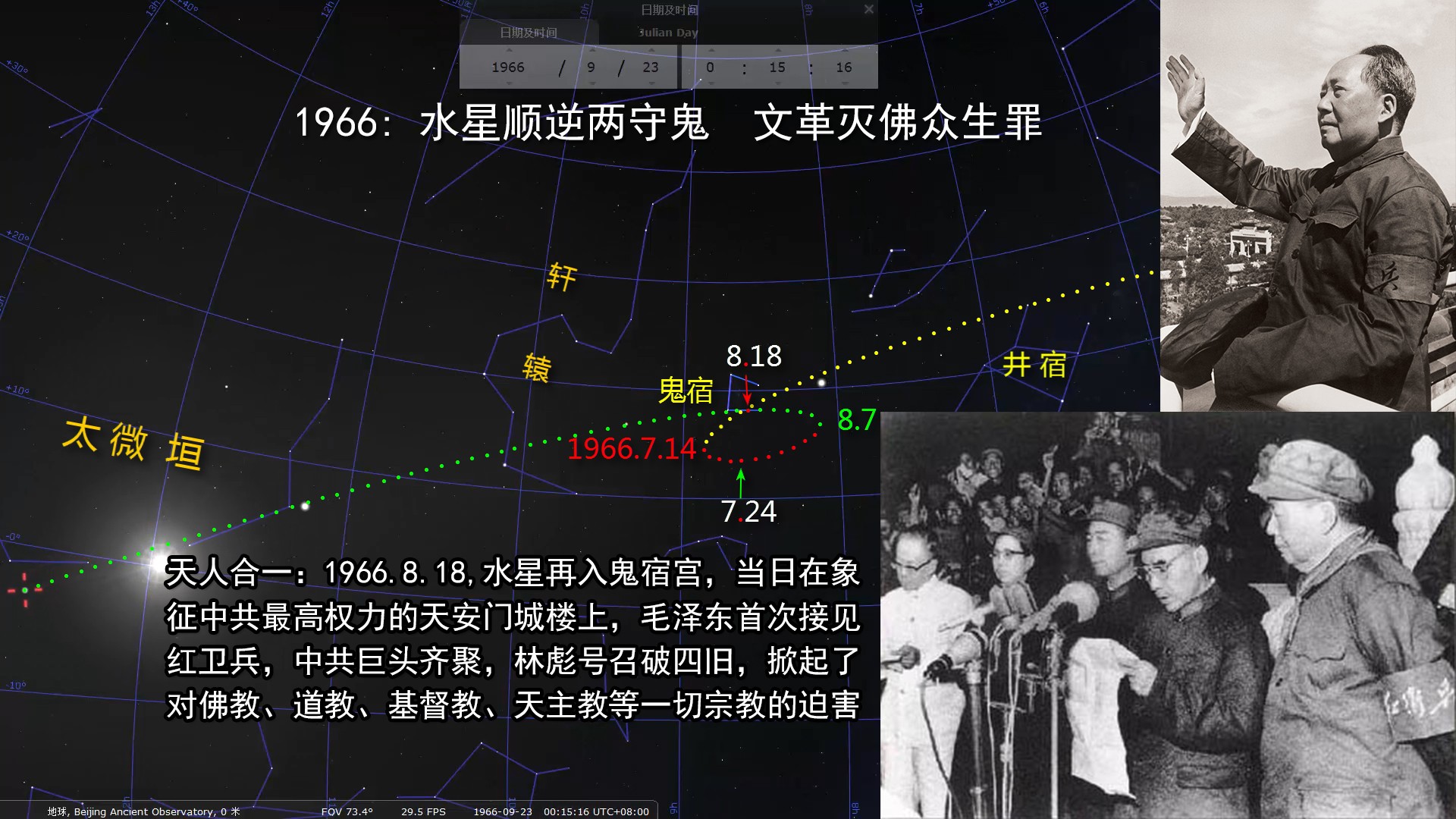 从星象上看,1966年8月18日,出现了水星入鬼宿的天象。当日,毛泽东第一次接见年轻无知的“红卫兵小将”,宣布“破四旧”,破除佛教、道教、基督教、天主教等一切宗教以及儒家礼教道德,统称灭佛,把文革的各种迫害推向顶峰。随后的十年浩劫,让中国的经济、文化、社会治安几近崩溃,一亿人被迫害,中国一半家庭被波及,非正常死亡2000万人。