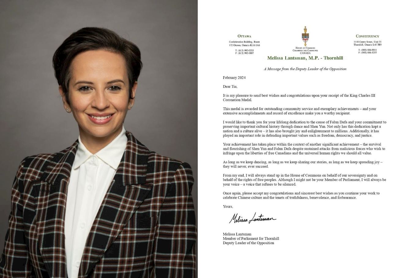 汤山(Thornhill)国会议员、保守党副领袖梅丽莎·兰茨曼(Melissa Lantsman)在贺信中表示:“我要感谢您长久地致力于法轮大法事业,并通过舞蹈和神韵演出保护珍贵的文化遗产。您的努力不仅让一个民族和文化得以延续和发扬,更为数百万观众带来了喜悦和启发。同时,这也在捍卫自由、民主和正义等核心价值方面发挥了重要作用。
