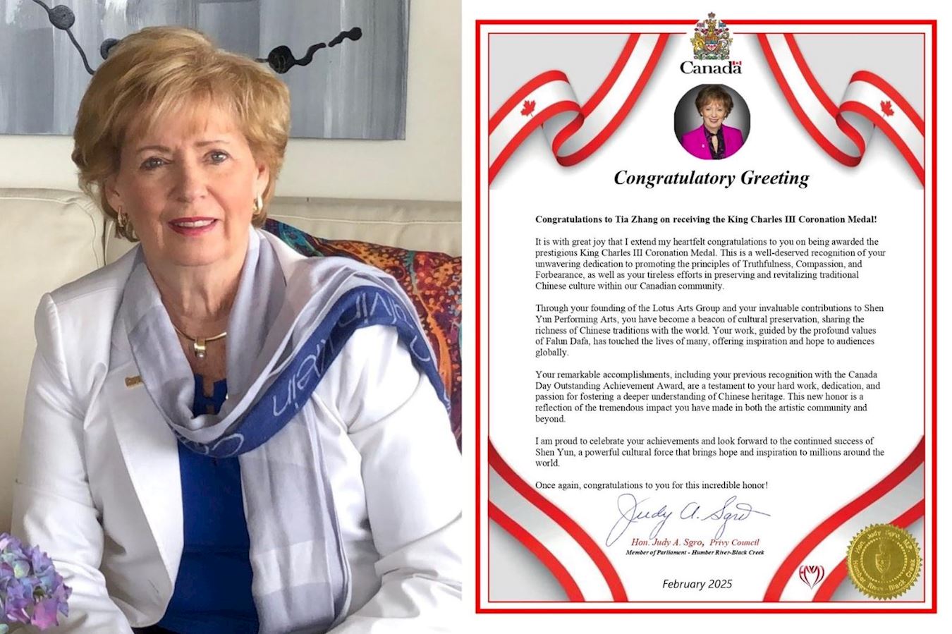 【明慧网二零二五年二月十五日】(明慧记者章韵加拿大报道)神韵舞蹈艺术家,飞天艺术学院前任校长,飞天艺术大学前舞蹈系系主任,法轮功学员张铁钧(Tia Zhang)女士荣获加拿大加冕奖章——查理三世国王加冕勋章(King Charles III’s Coronation Medal)。