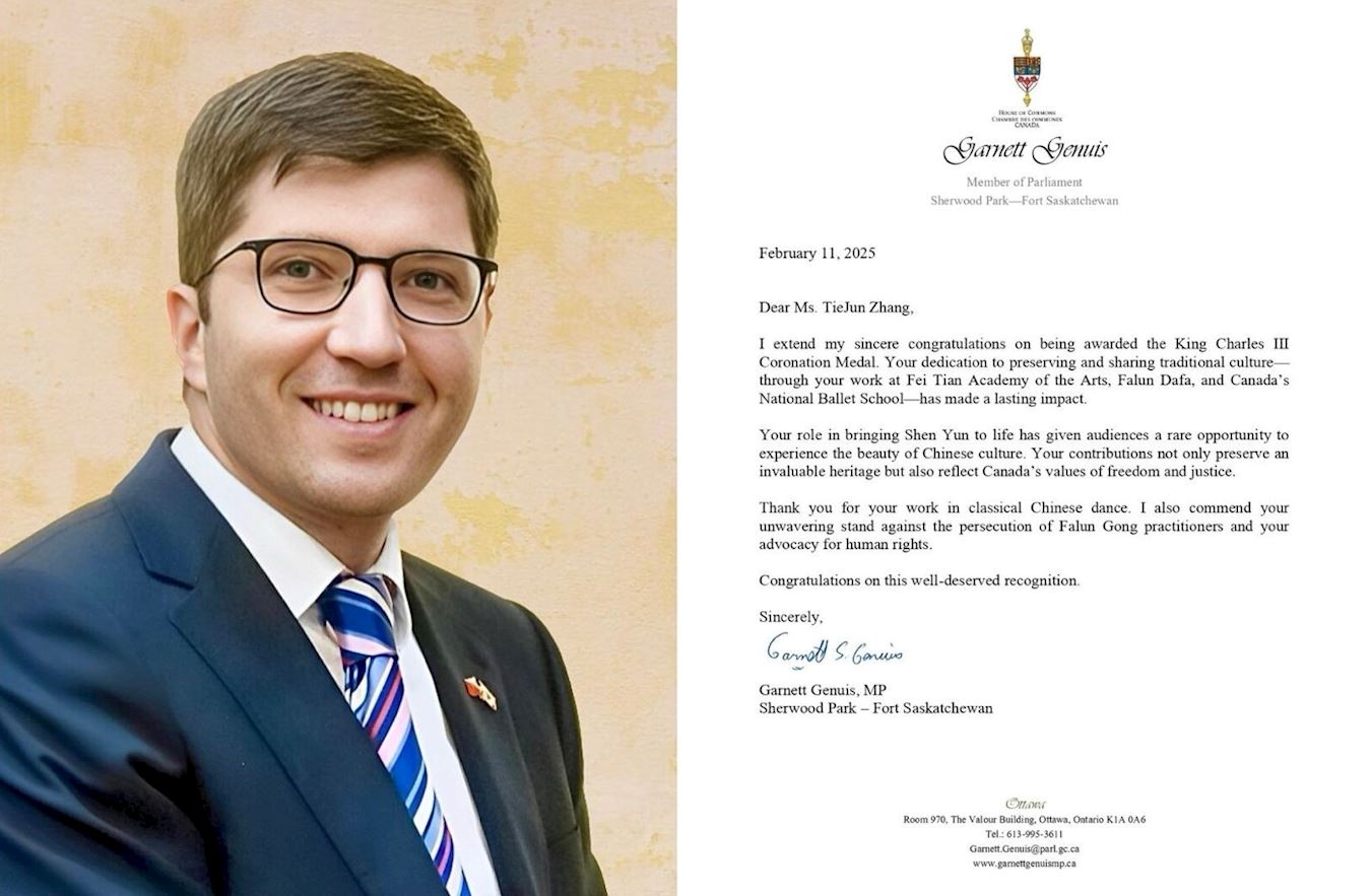 加拿大“国会法轮功之友”主席、国会议员加内特·吉尼斯(Garnett Genuis)的贺信中说:“您通过在飞天艺术学院, 法轮大法和加拿大国家芭蕾舞学校的工作,致力于保护和传播传统文化,产生了深远的影响。