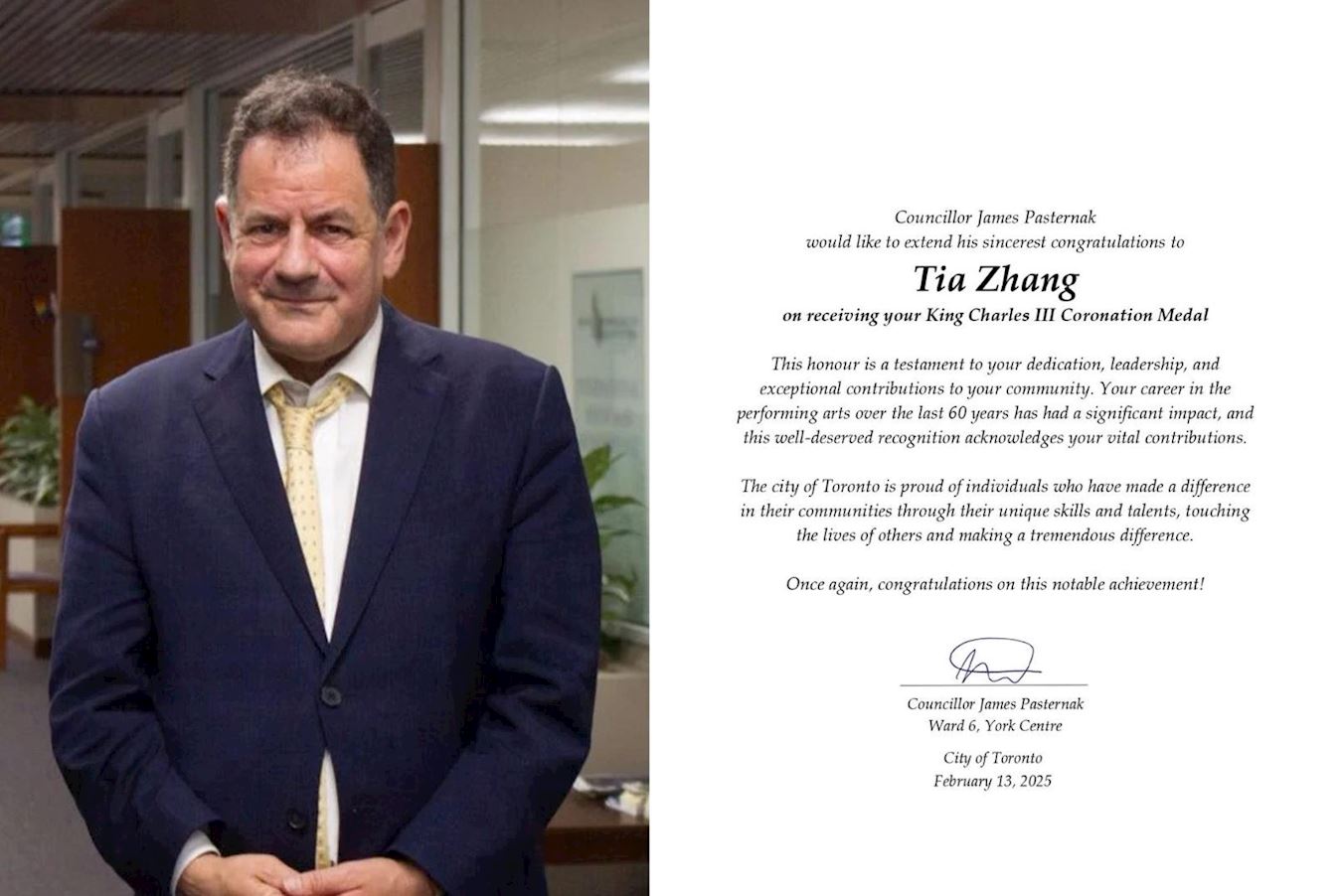 市议员詹姆斯·帕斯特纳克(James Pasternak)也为张铁钧(Tia Zhang)女士发来了褒奖。褒奖中说:“在过去六十年中,您在表演艺术领域的成就对社会产生了深远的影响,这份荣誉彰显了您做出的重要贡献。