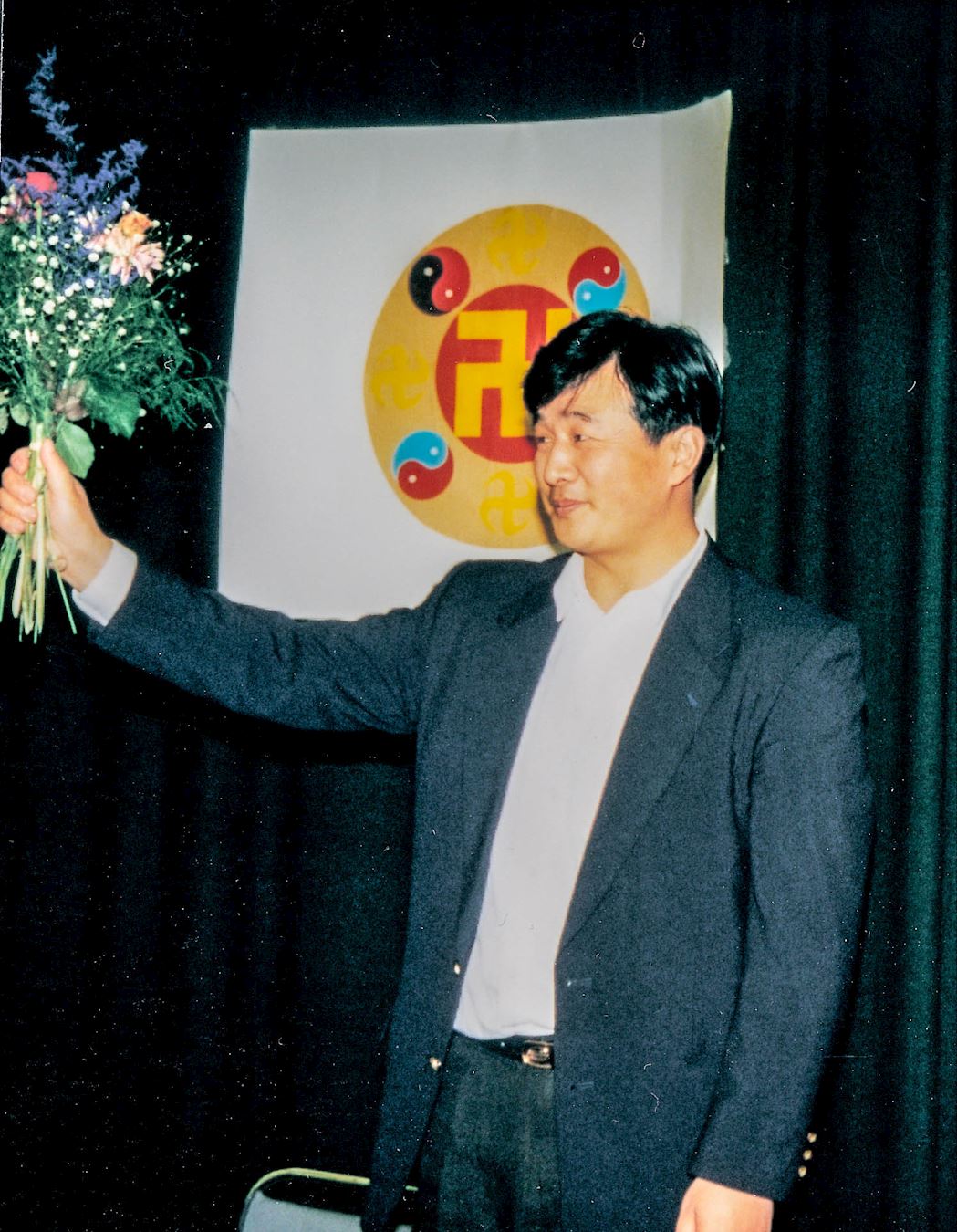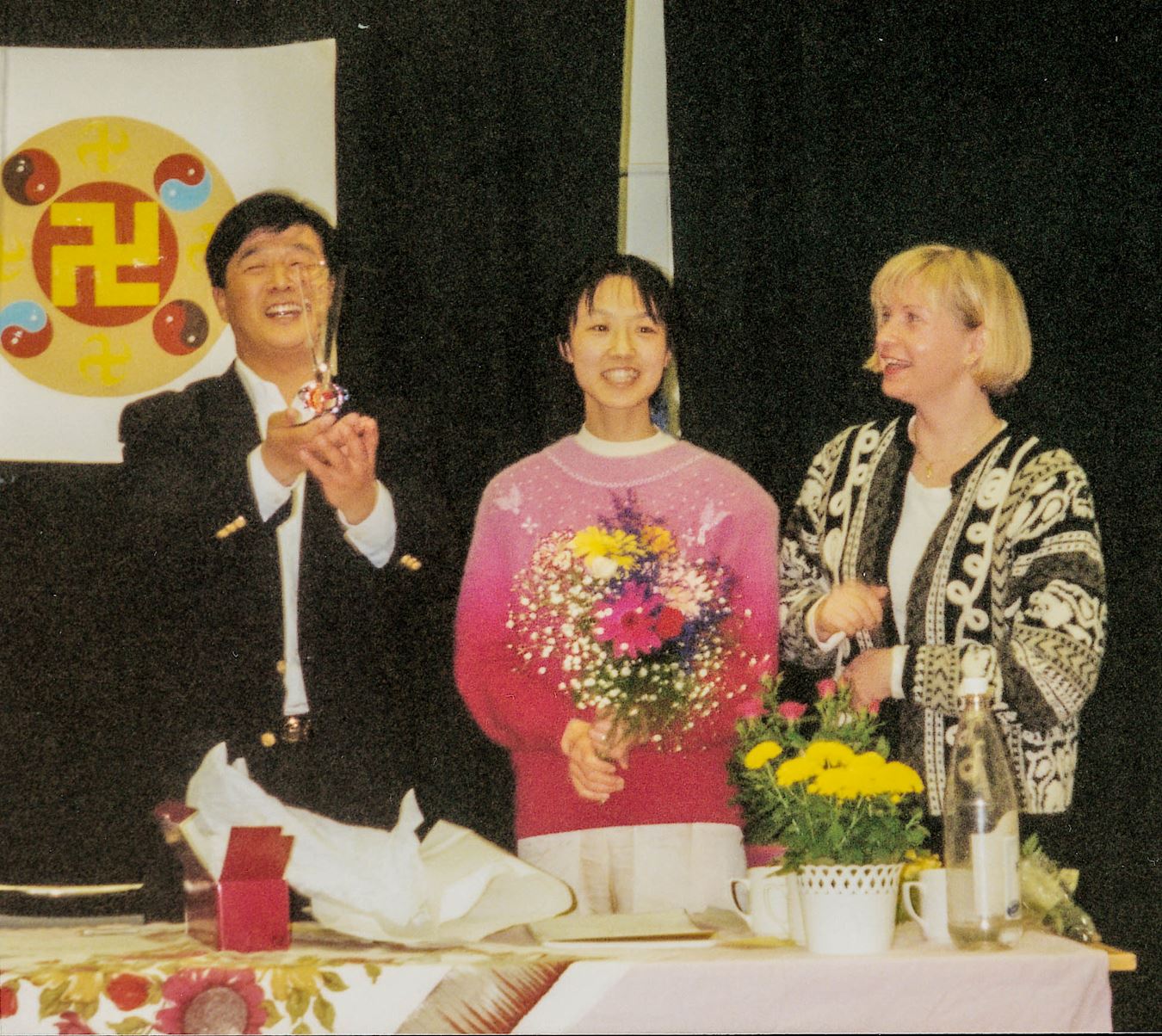 ![]() 图1:一九九五年四月李洪志师父在瑞典哥德堡举办的传功讲法班结束后,学员上台向师父献花并赠送了小纪念品,师父接过鲜花微笑向大家挥手作别。 |