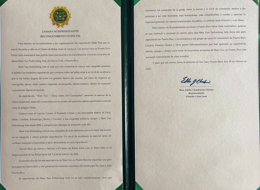 二零二五年二月十日,在美国神韵新世界艺术团为波多黎各观众带来本演出季最后一场演出之前,波多黎各众议院议员艾迪·查博尼尔·奇尼(Eddie Charbonier Chinea)在波多黎各国会大厦向神韵艺术团代表,以及波多黎各法轮大法协会代表颁发褒奖,感谢神韵莅临波多黎各带来文化艺术盛宴。