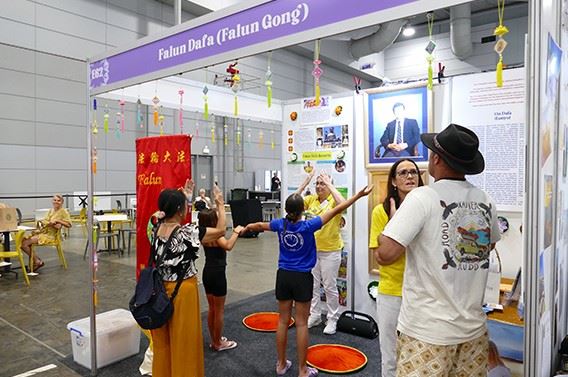 两个小女孩热情地询问父亲是否可以学功。他扫视了展位,微笑着说:可以。父亲最近从其它地方学了一些动作,他想知道这是不是法轮功。法轮功学员解释说,这是两种不同的功法,并建议他最好选择一种功法,这样才能获得其好处。
