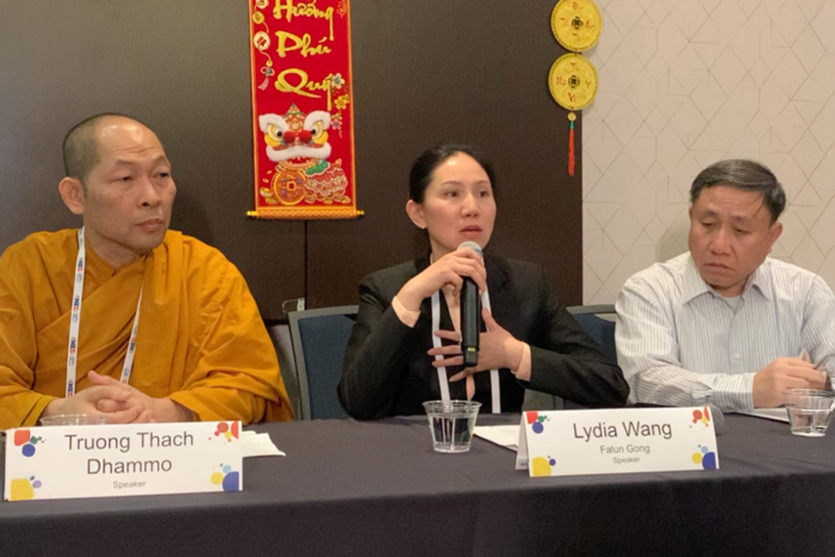 ![]() 图1:法轮功学员王珊珊(Lydia Wang)在专题讨论会上发言,强调保护宗教迫害幸存者的重要性。 |