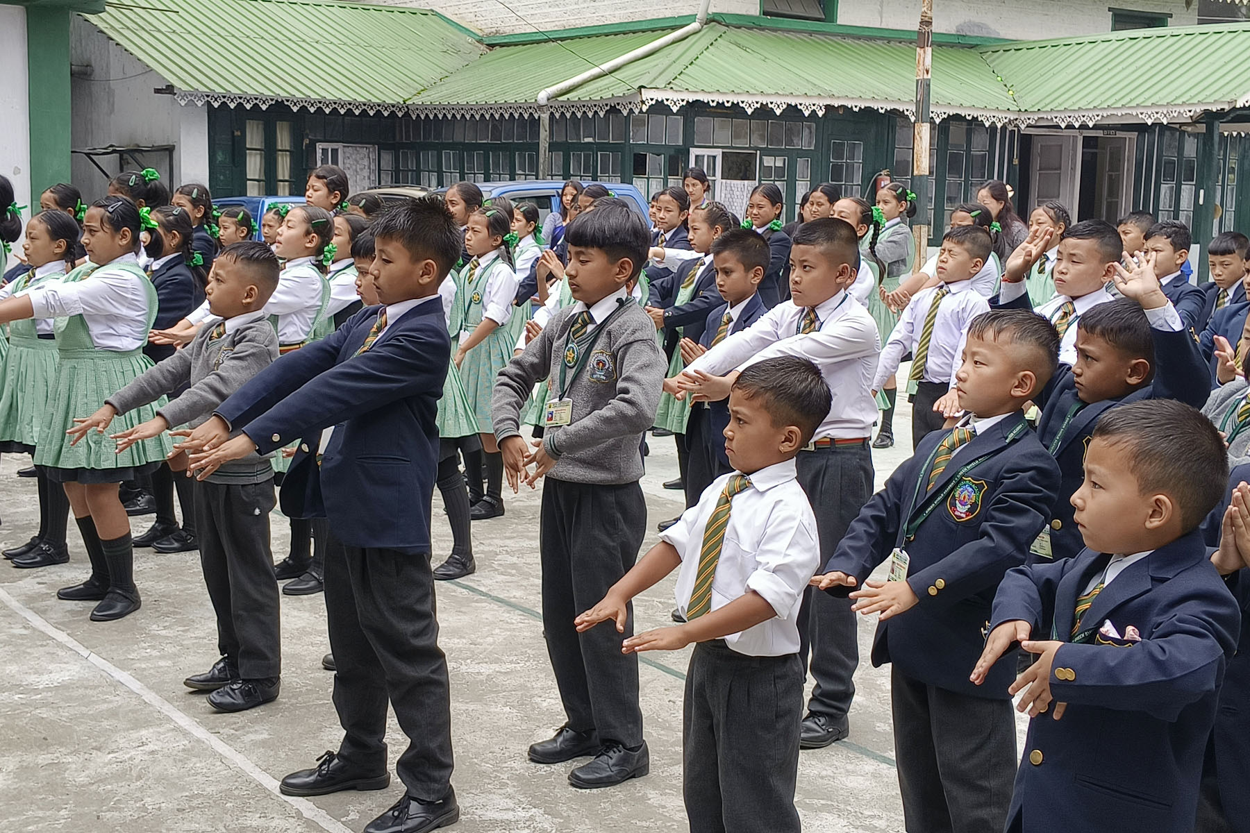 ![]() 图6~11:锡金拉翁拉(Ravangla)学校的学生们学炼法轮功五套功法。 |