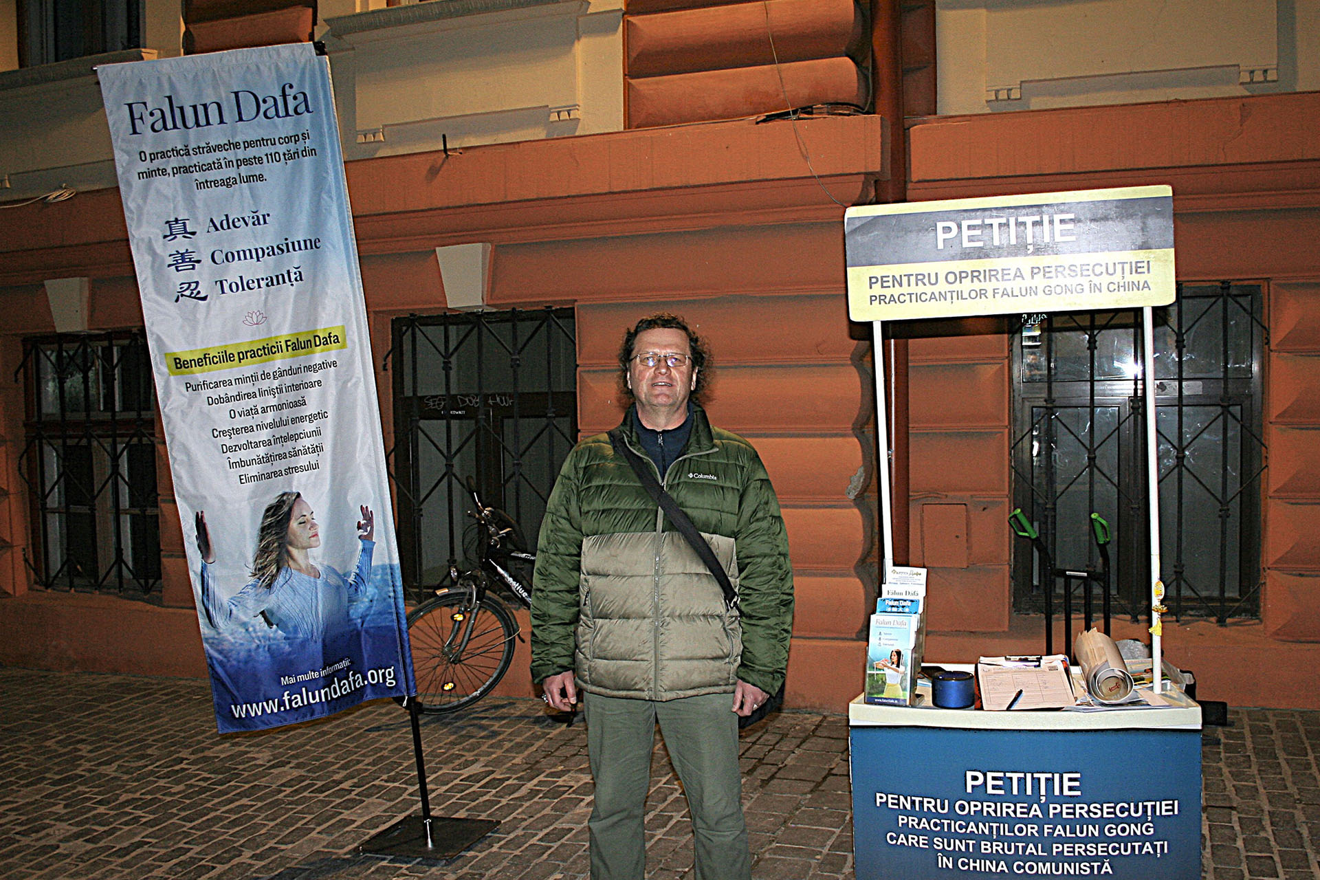 ![]() 图12:二零二五年三月十五日,在布拉索夫,米哈伊·奥拉柳声援制止中共对法轮功修炼者的迫害。 |