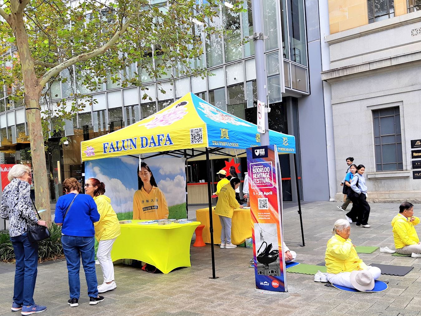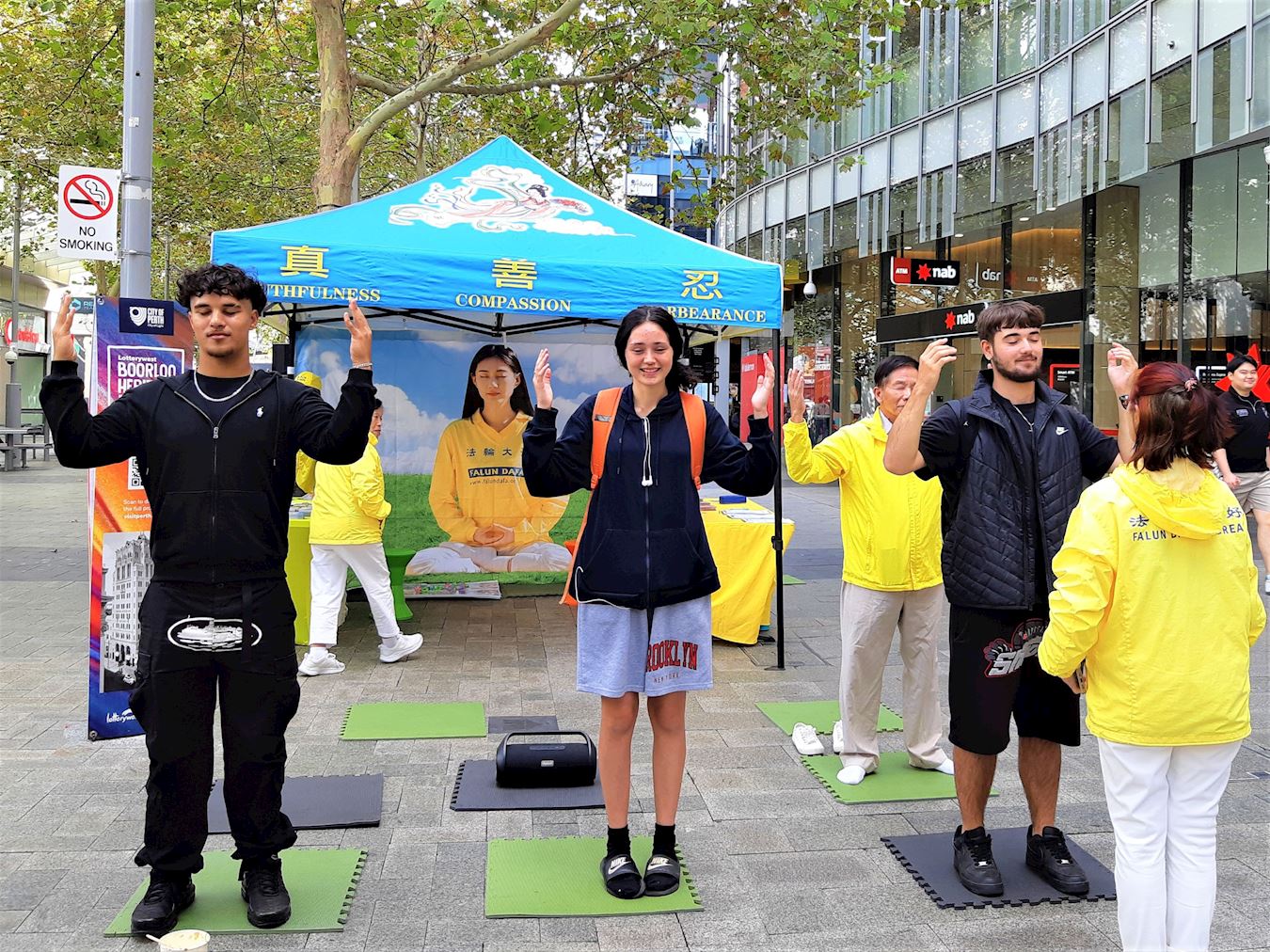 集会结束后,身着黄色T恤、白色长裤的法轮功学员伴着悠扬的炼功音乐在林荫道旁演示着五套功法,祥和的场面,吸引着来州议会大厦的人们。