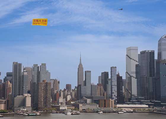 纽约上空飘扬“法轮大法好”纪念四·二五和平上访