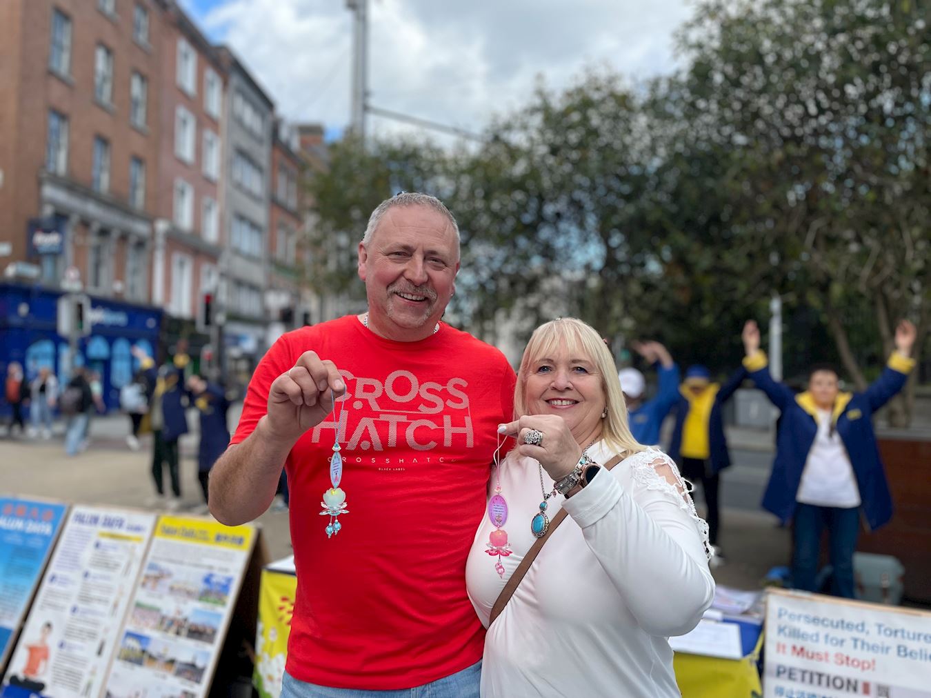 阿拉斯泰尔(Alastair)和太太伊莱恩(Elaine)是第一次听说法轮功。得知功法教人按照真、善、忍做好人,阿拉斯泰尔说,“这个准则太棒了,启迪人心。即使面对苦难,我希望你们都能坚持下去”。